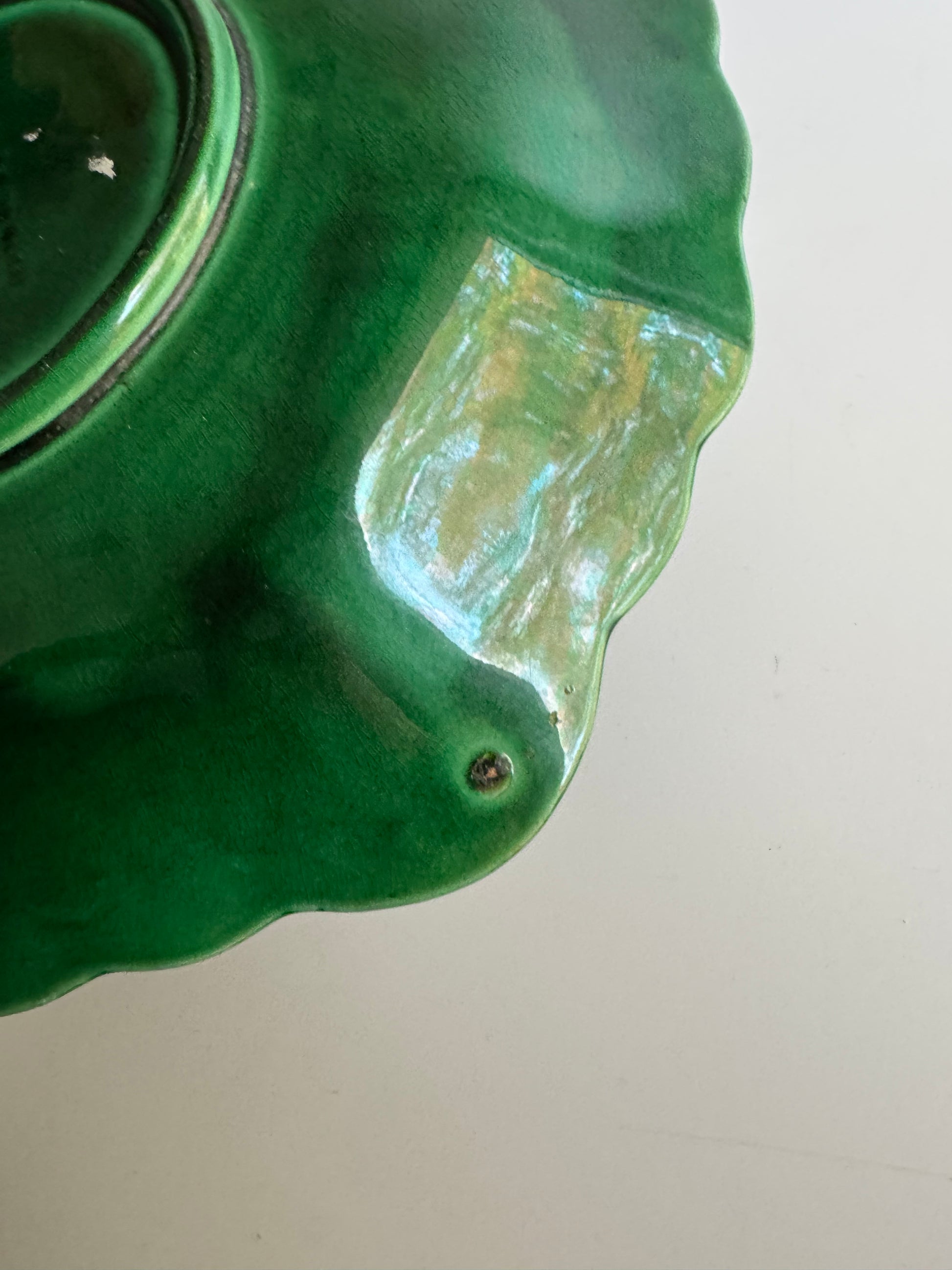 A richly glazed antique majolica leaf plate in deep emerald green with exquisite modeling and naturalistic detail. Crafted in Portugal around 1900, this piece features a beautifully sculpted cabbage leaf form with an integrated handle, finished in a glossy, variegated glaze that accentuates every vein and fold. The underside bears impressed and painted markings consistent with early 20th-century Portuguese production.