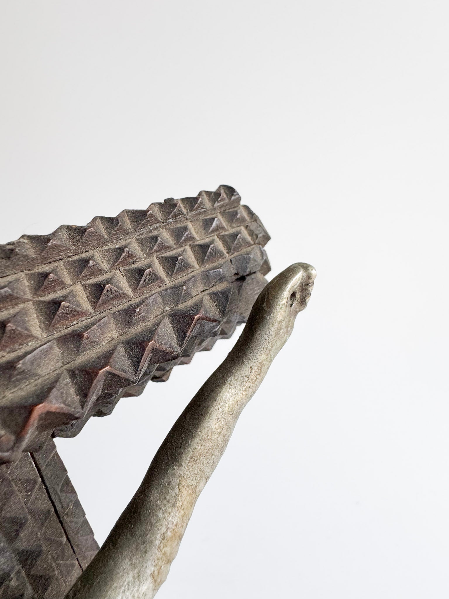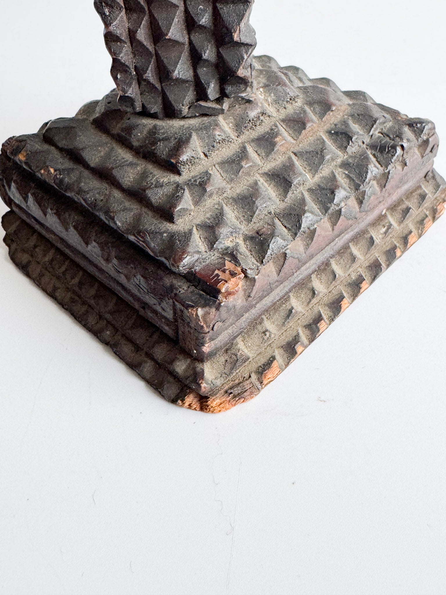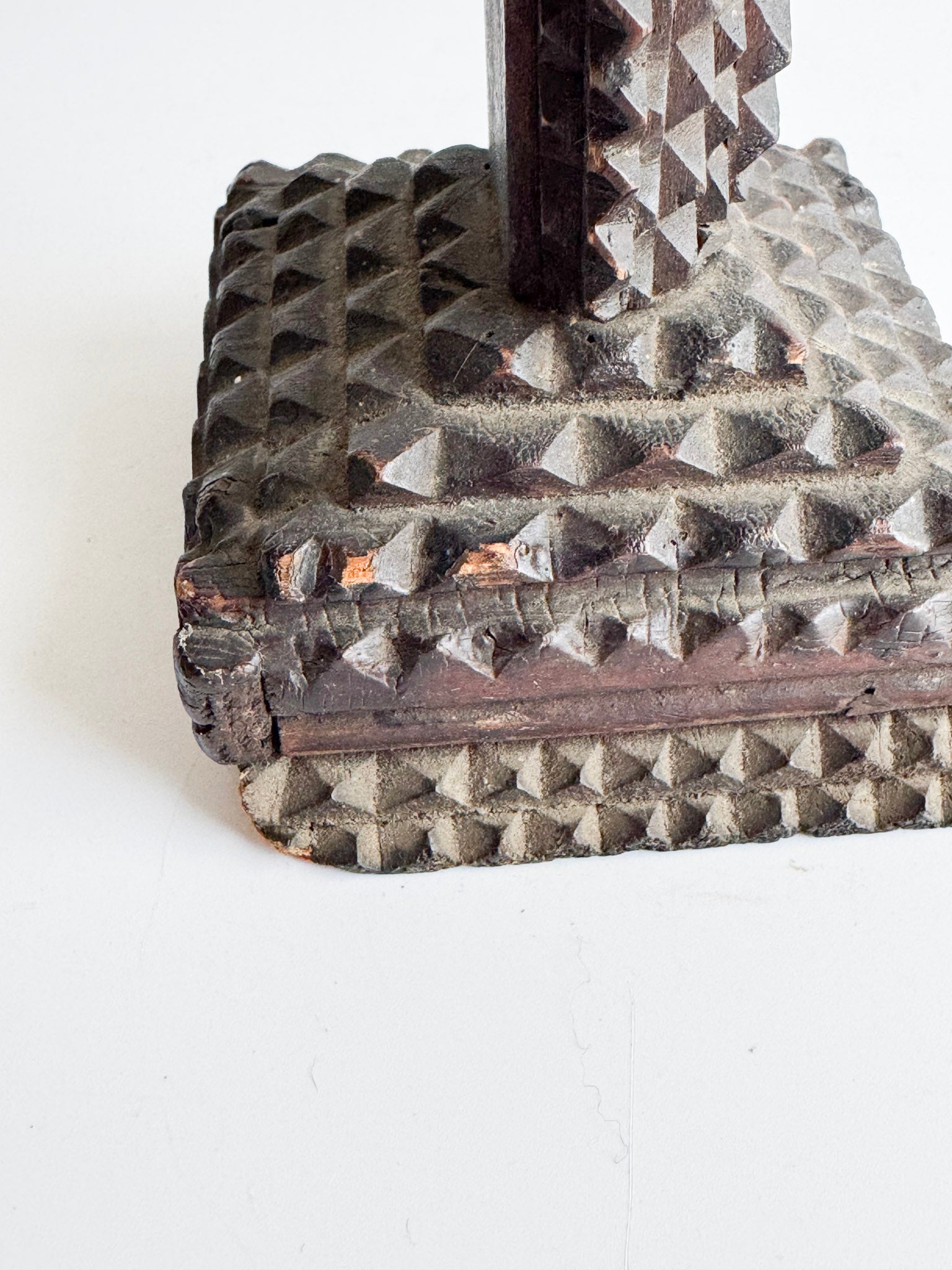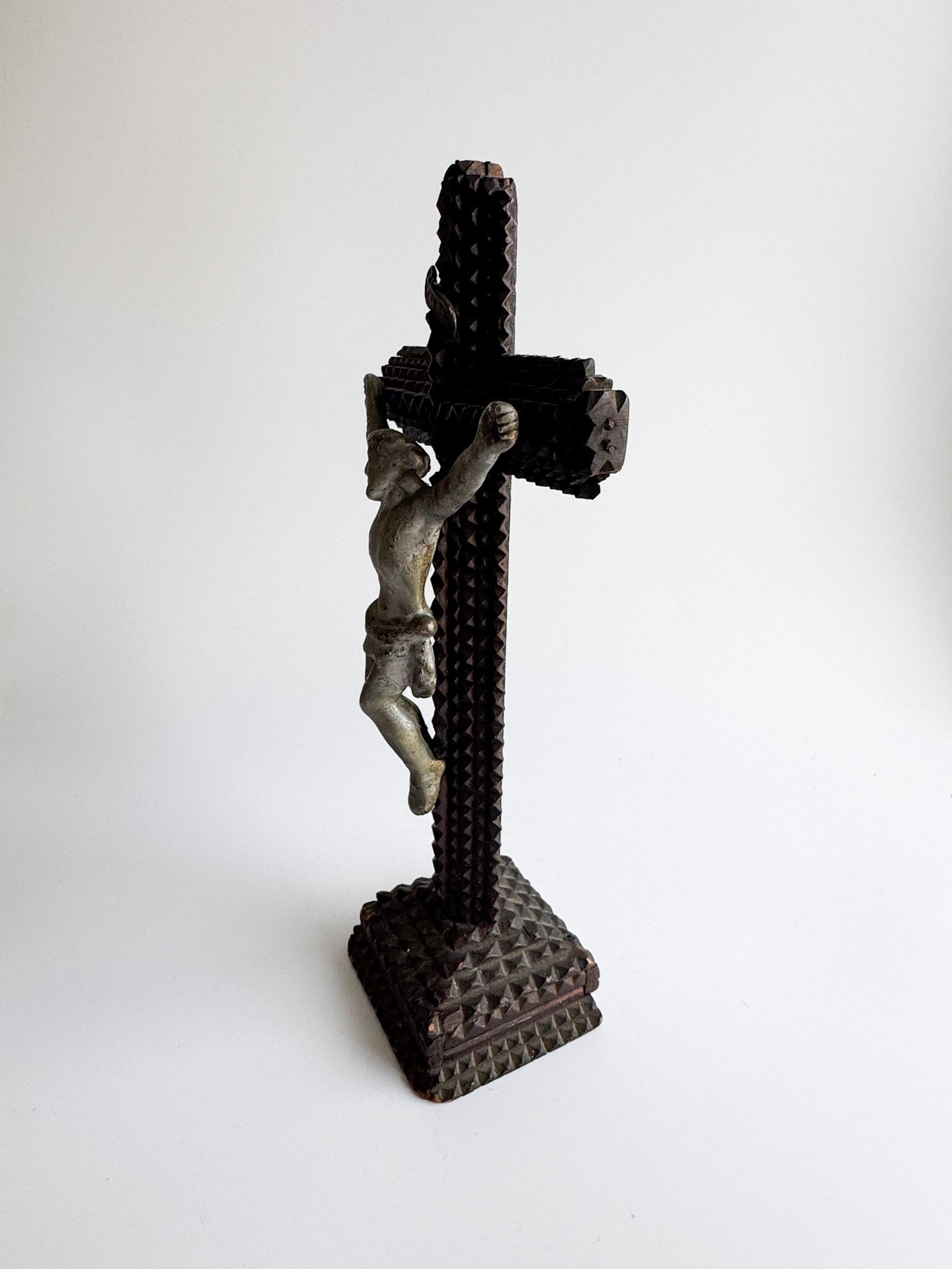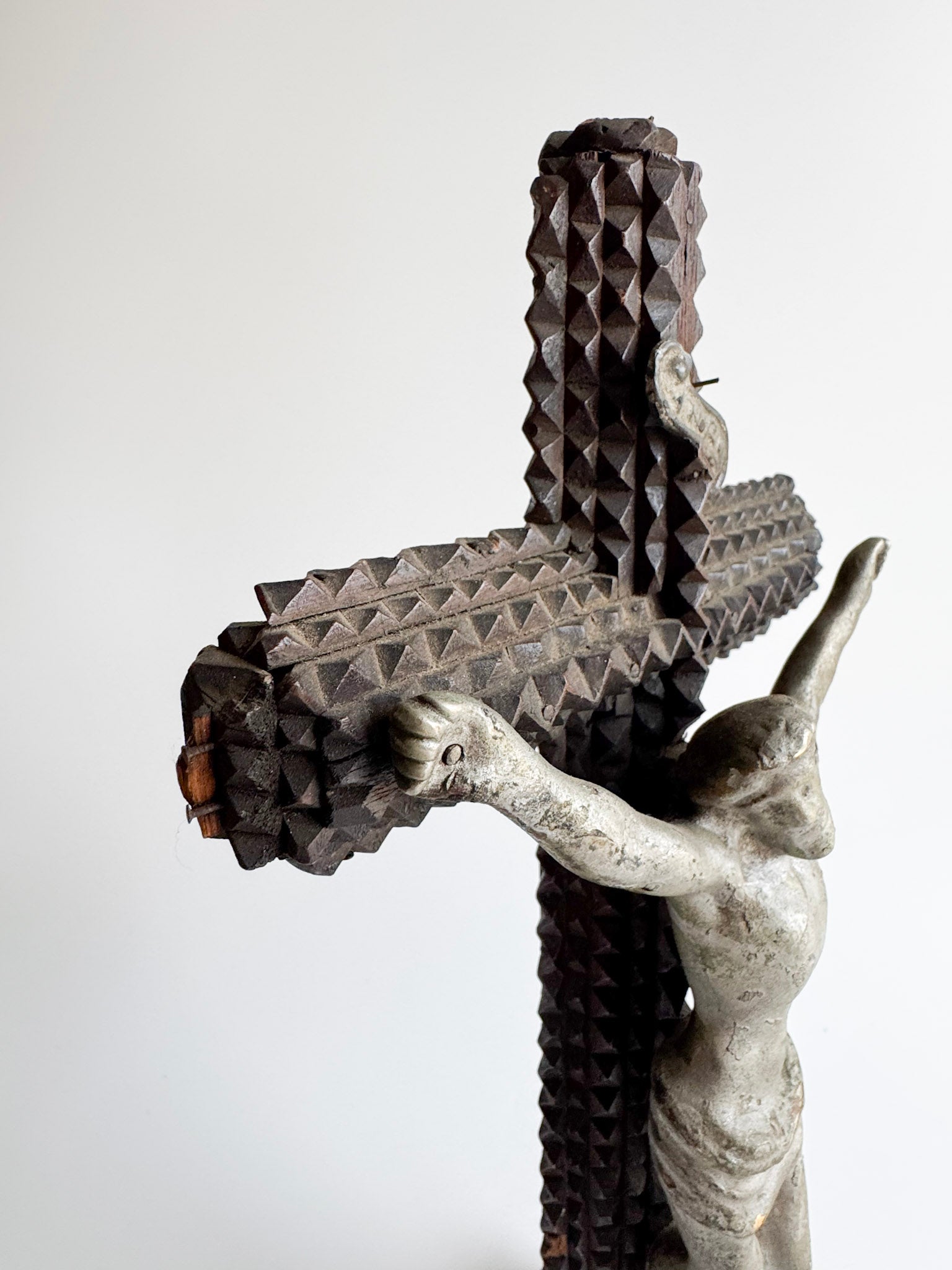A powerful and soulful antique tramp-art crucifix, hand-carved in the classic layered chip-carving style, featuring hundreds of individually cut pyramid forms. The cross sits on a stepped base with the same intricate carving, and displays a cast-metal corpus of Christ with beautiful age and patina. The INRI banner is original.