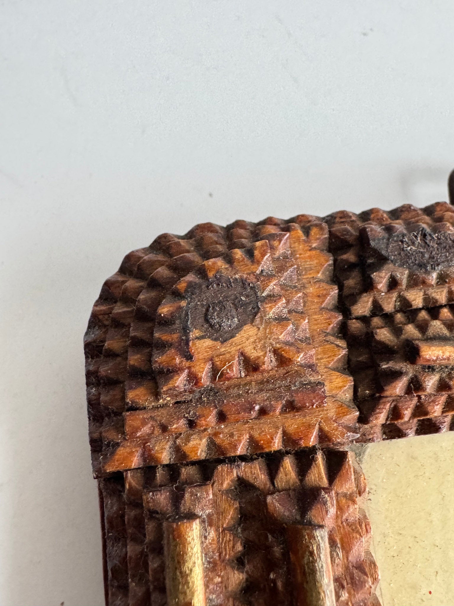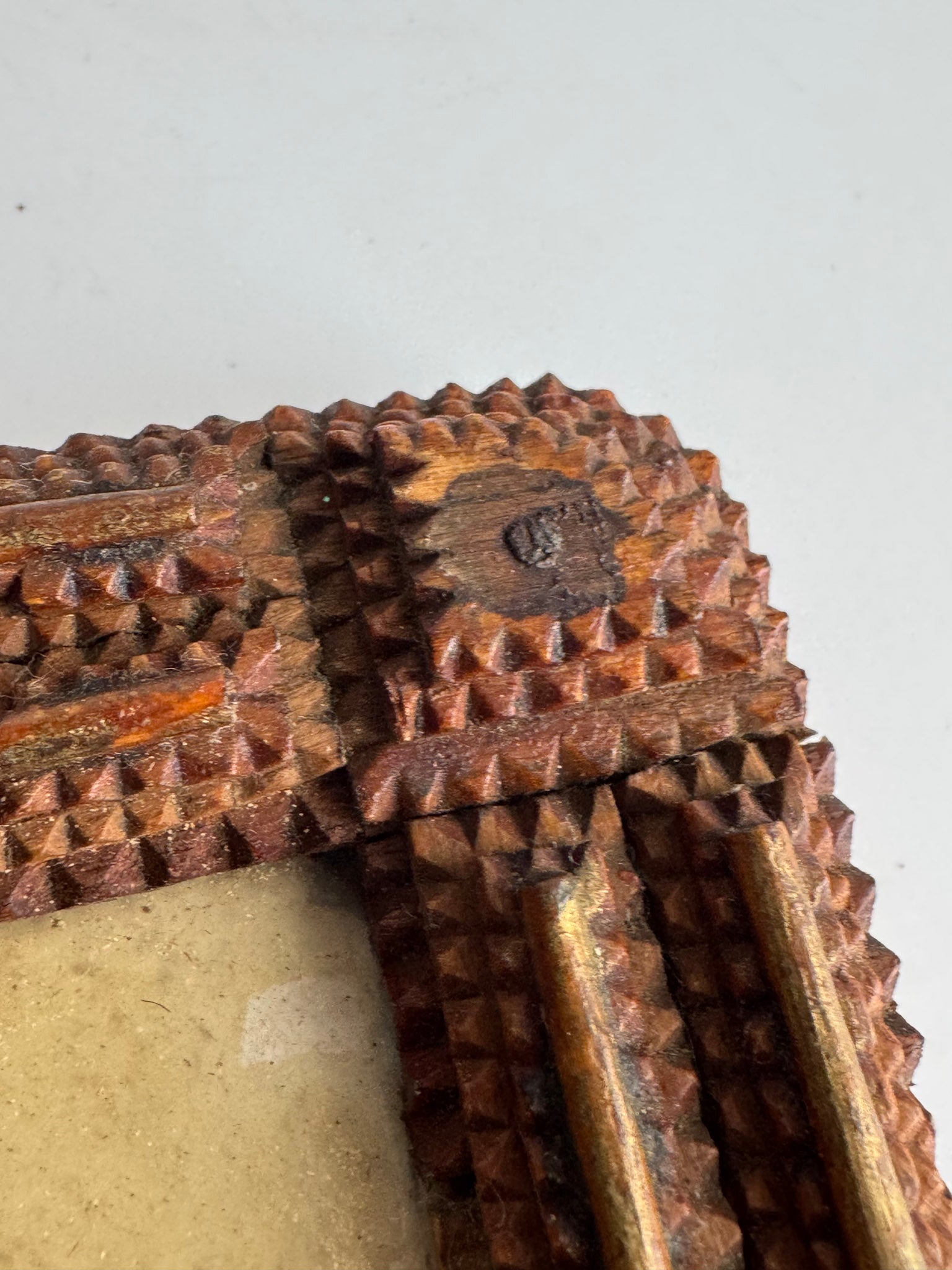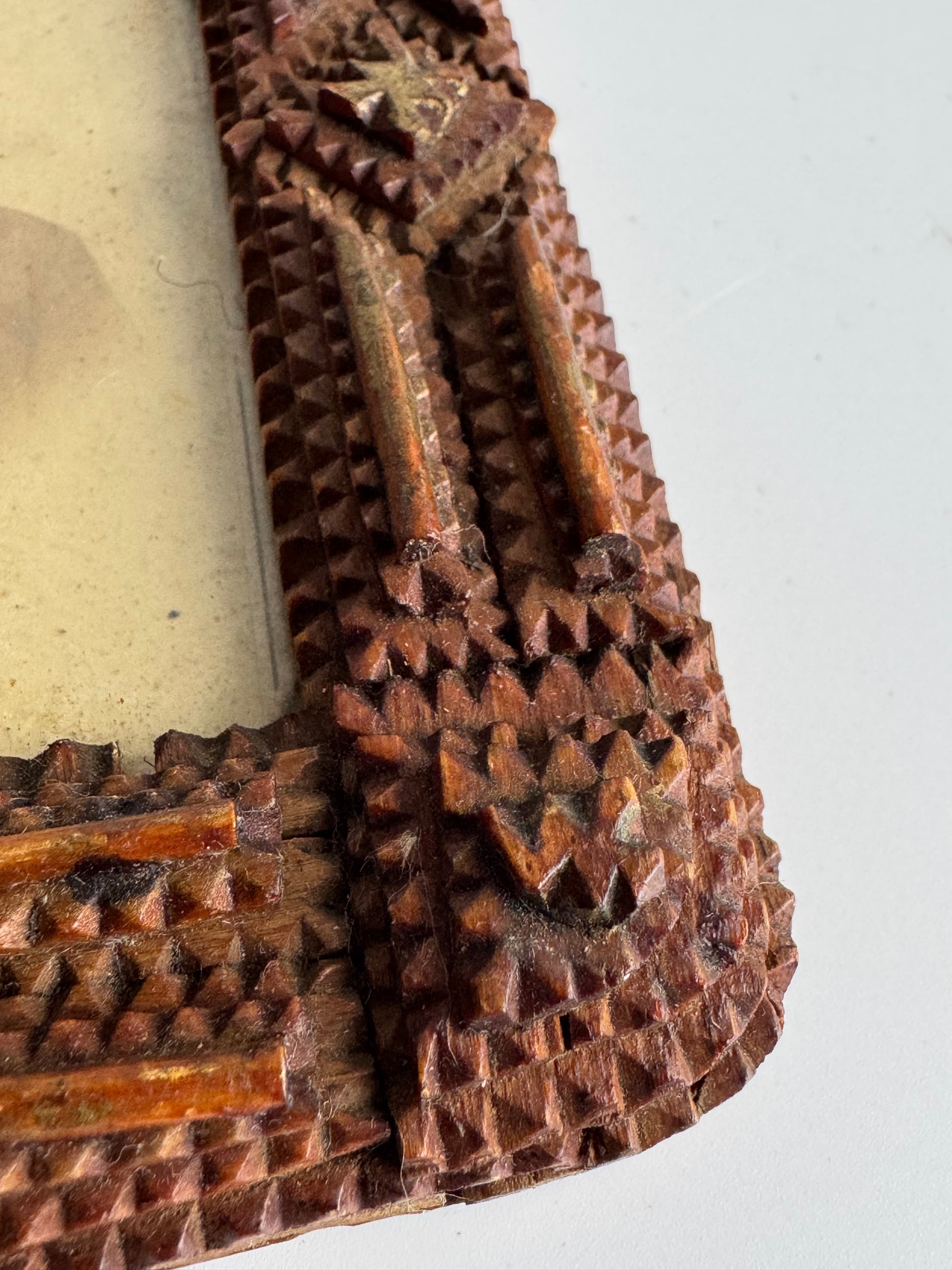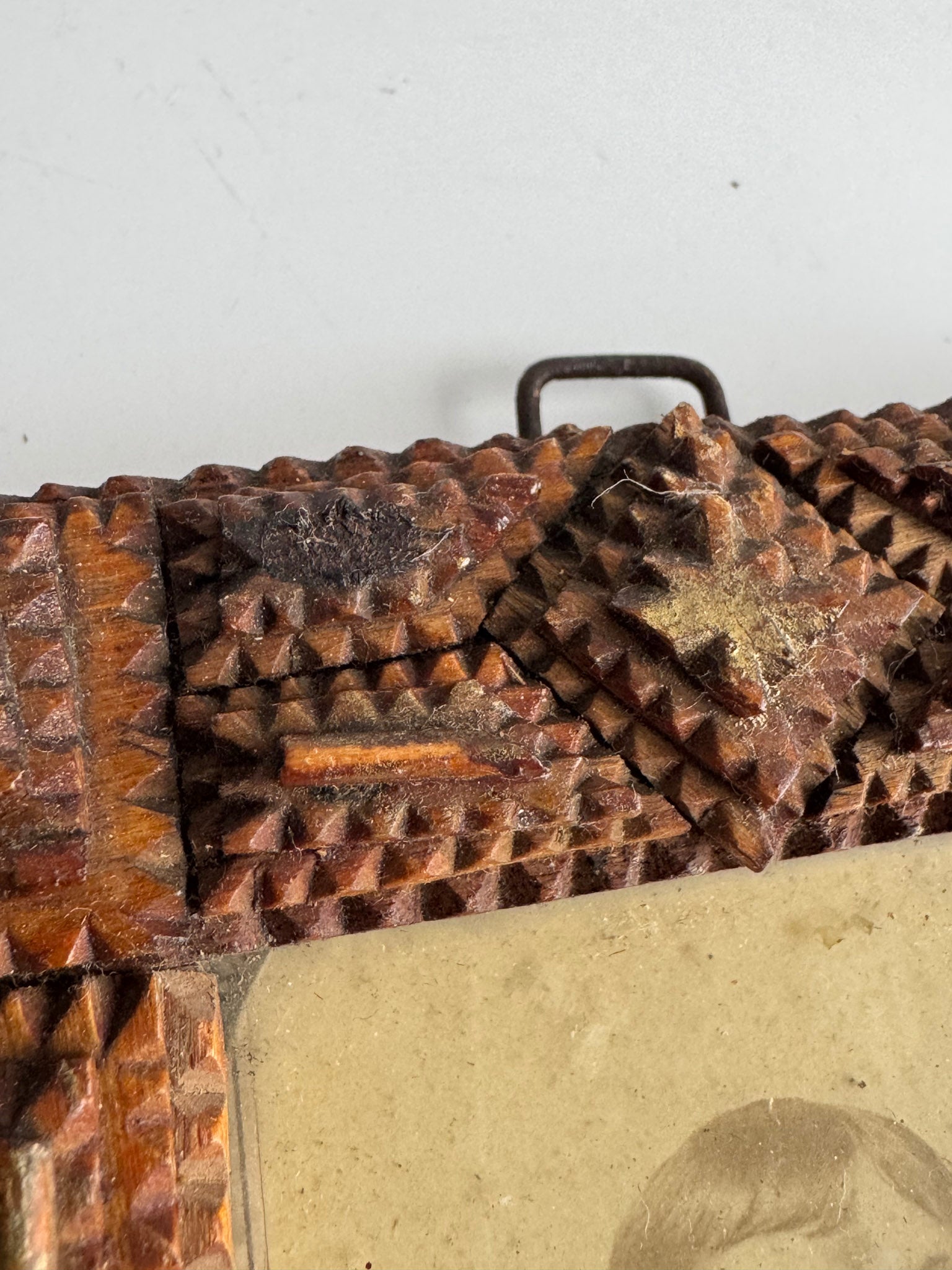 Early 20th-century American tramp art picture frame featuring deeply carved, geometric chip-carving throughout. The frame retains its original sepia-toned portrait, lending strong character and authenticity.