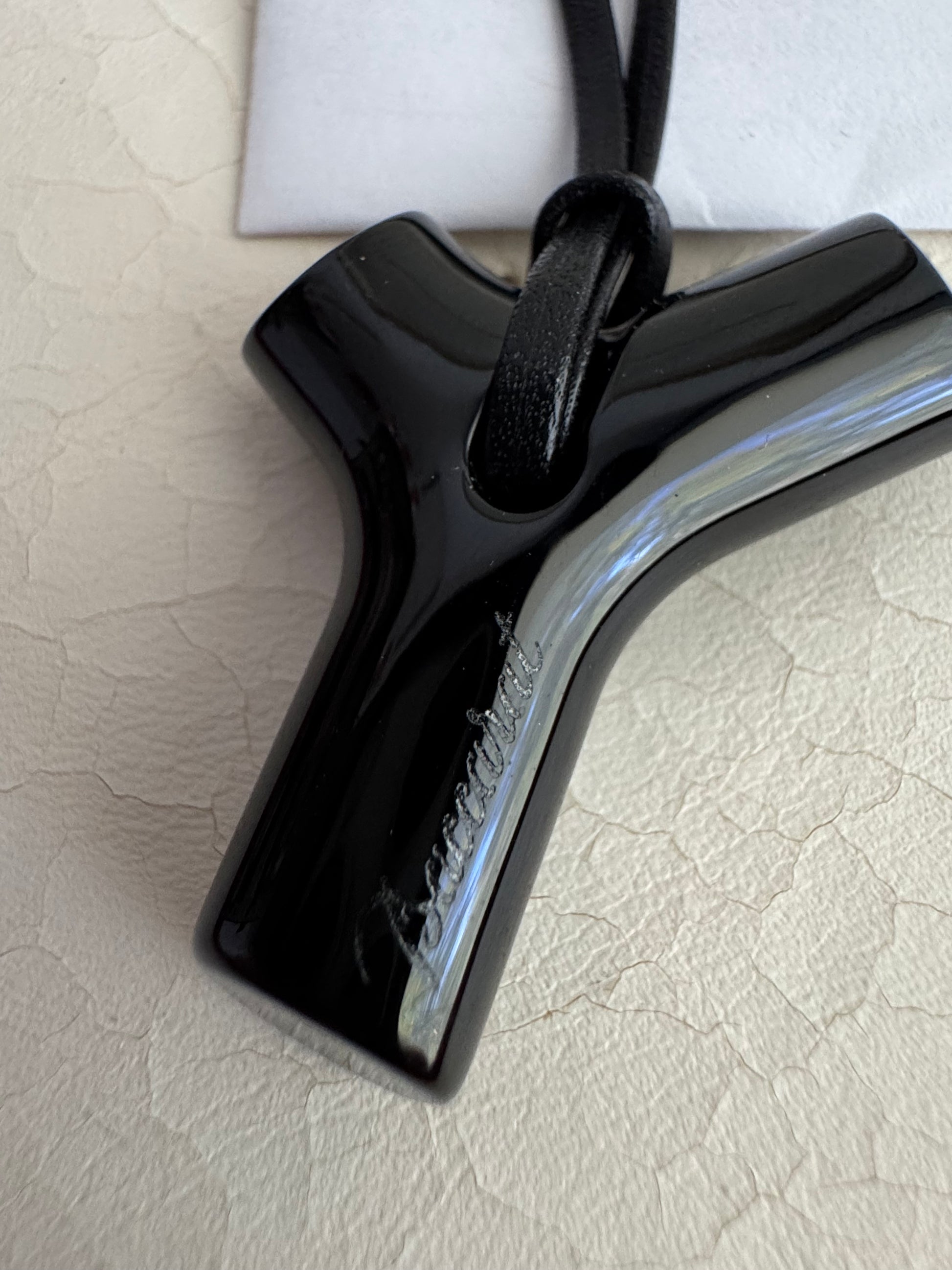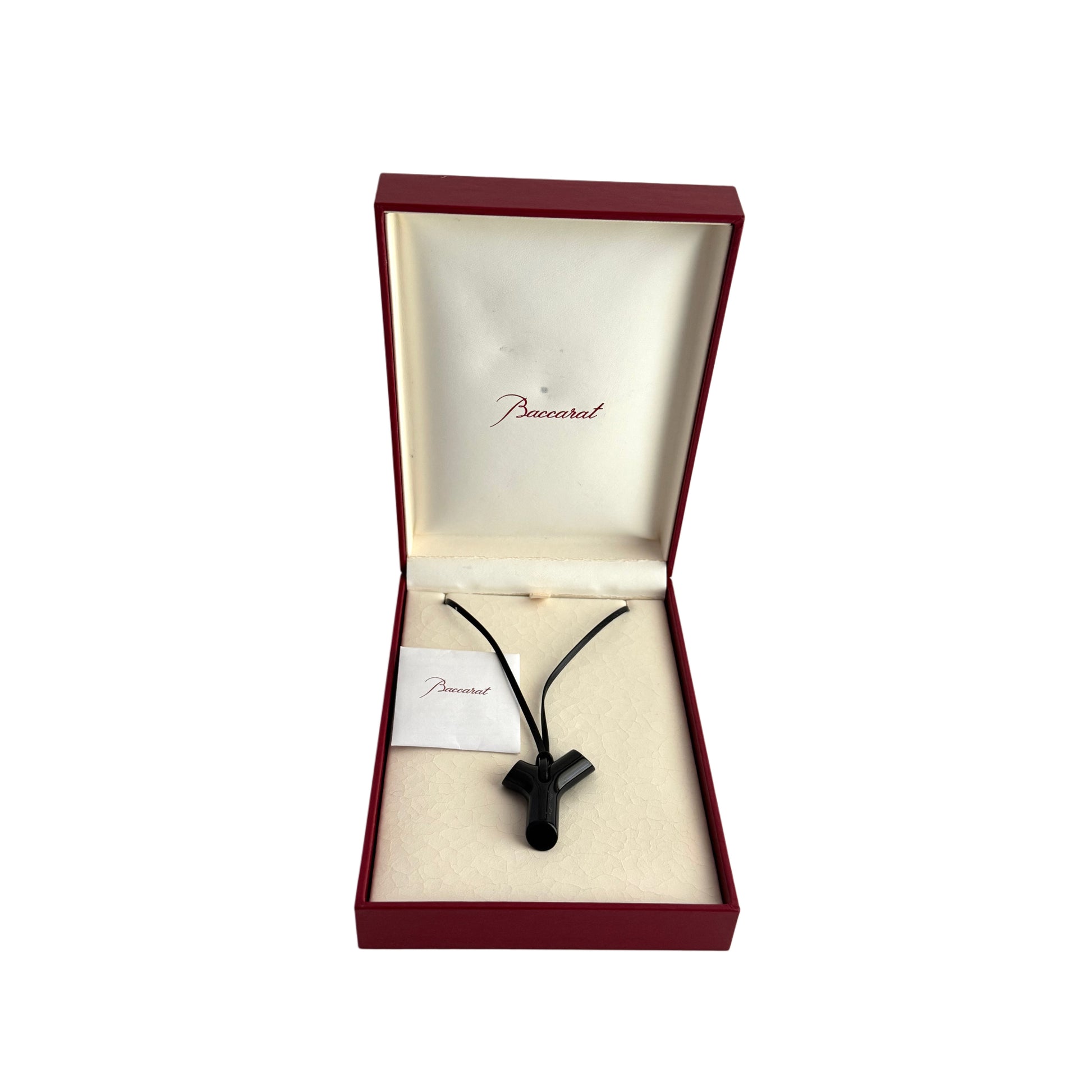 A striking Baccarat black crystal pendant necklace, crafted in the iconic “Spirit” cross design. This sculptural piece showcases Baccarat’s renowned mastery of crystal artistry, with clean, modernist lines and a high-gloss finish that reflects light beautifully. The pendant is suspended from a supple black leather cord with a silver-tone clasp, making it equally wearable for both men and women.