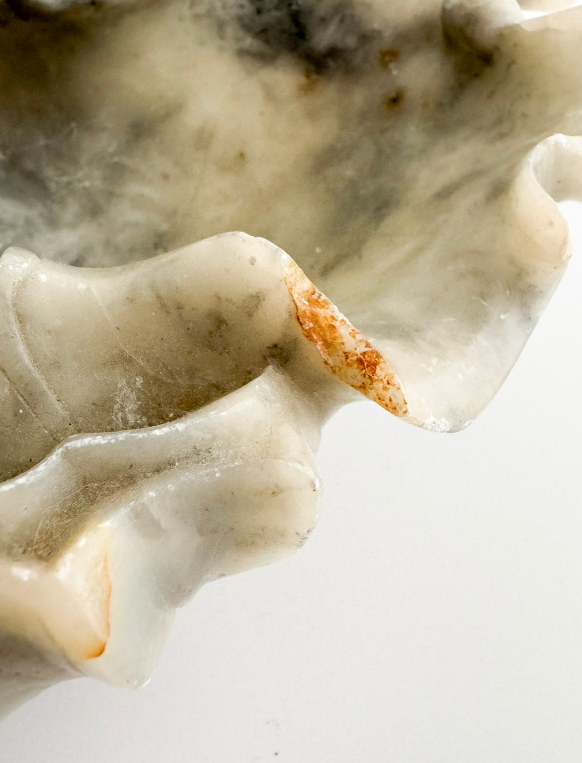 A beautifully hand-carved soapstone dish depicting a lotus leaf surrounded by lotus pods and buds — a motif symbolic of purity and renewal in Asian art. The natural veining of the stone, ranging from soft grey to ivory and light umber, enhances its organic form and fluid carving. Likely created in mid-20th century China, this piece showcases remarkable craftsmanship, with delicately undulating edges and finely incised botanical details.