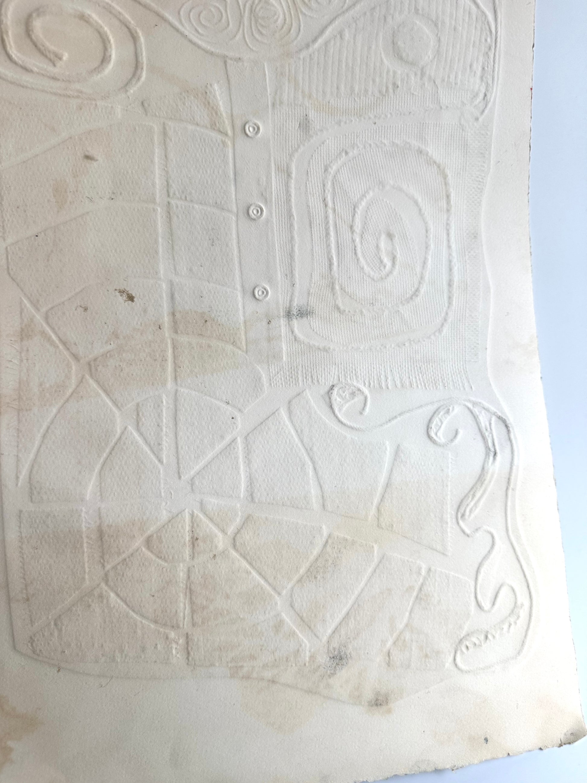 This striking abstract composition is created through a textured embossing and inking process on heavy artist paper. The layered relief surface features intricate geometric and spiral motifs, rendered in deep indigo tones that shift subtly across the surface.