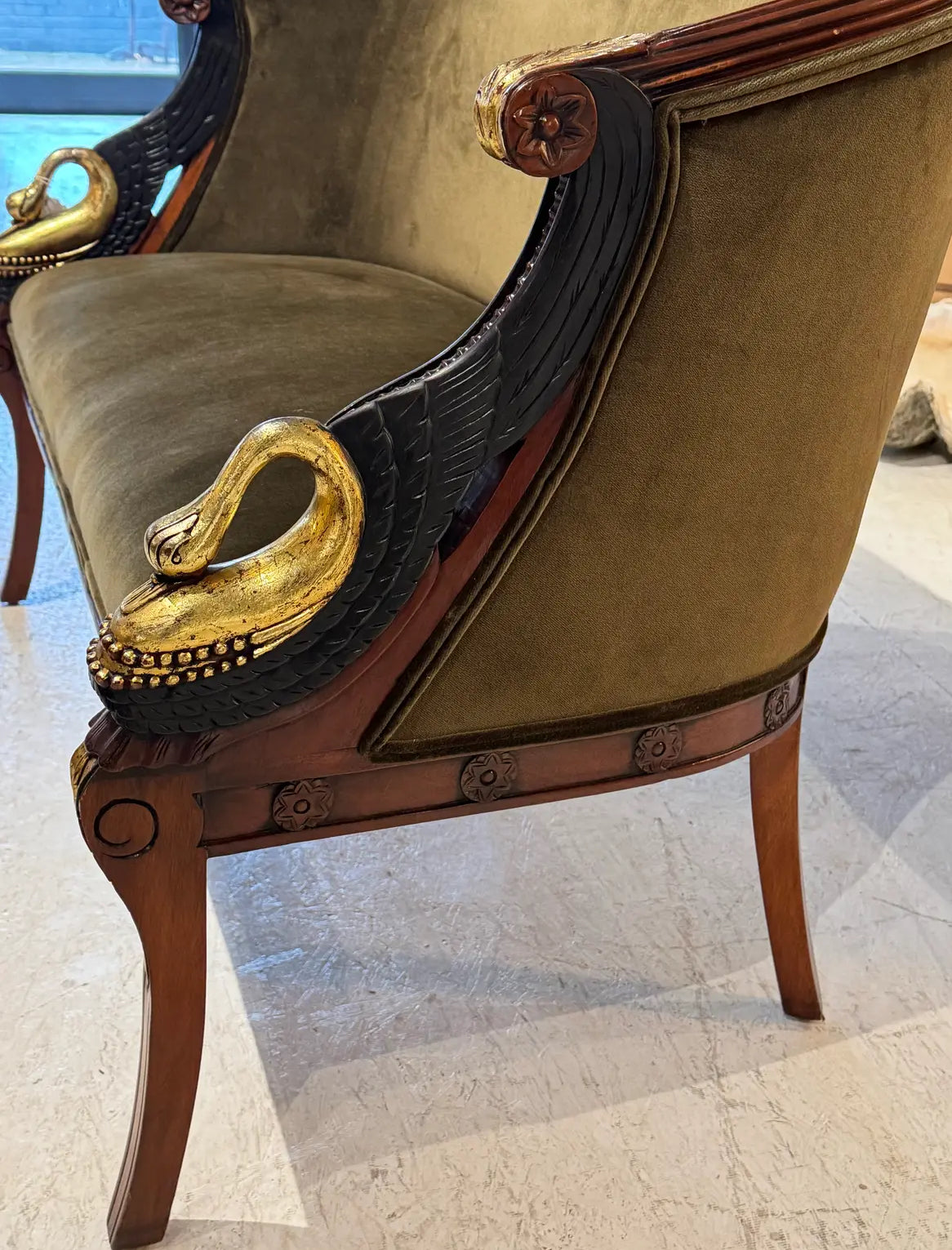 Elegant and sculptural, this vintage Empire-style settee features a finely carved mahogany frame highlighted by gilt and ebonized swan armrests—an iconic neoclassical motif symbolizing grace and power. The frame has been professionally refinished, preserving its rich patina while enhancing the carved details. Newly reupholstered in a luxurious olive green velvet, the piece achieves a sophisticated balance between timeless grandeur and modern elegance.