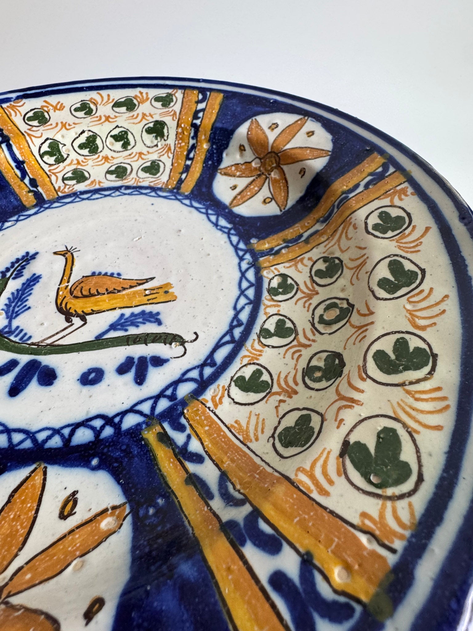 A beautifully hand-painted vintage Italian majolica plate, richly decorated in cobalt blue, ochre, and green. The center features a charming folk-art style bird perched on a branch, surrounded by alternating floral and patterned segments that give the piece wonderful movement and visual interest.