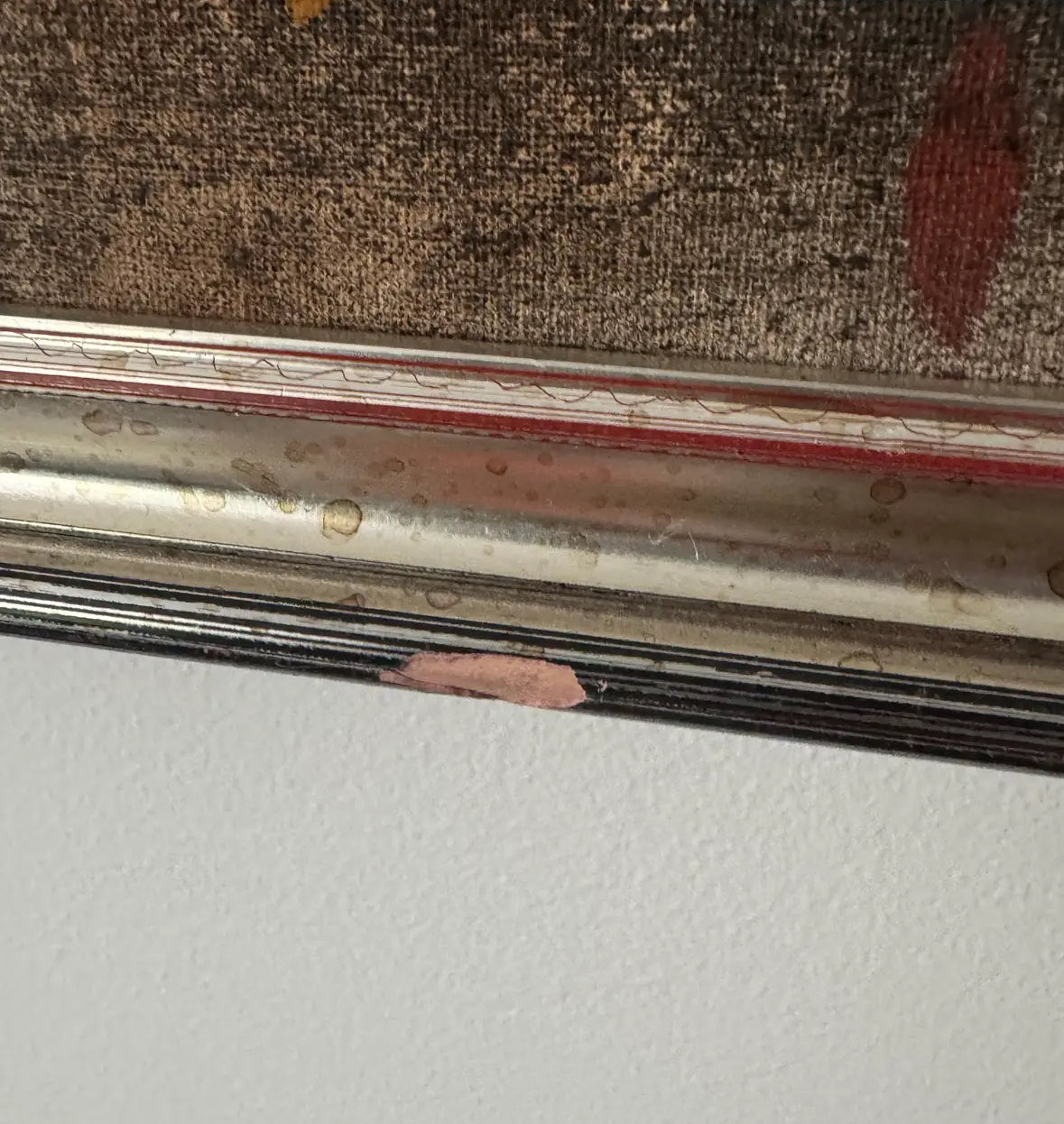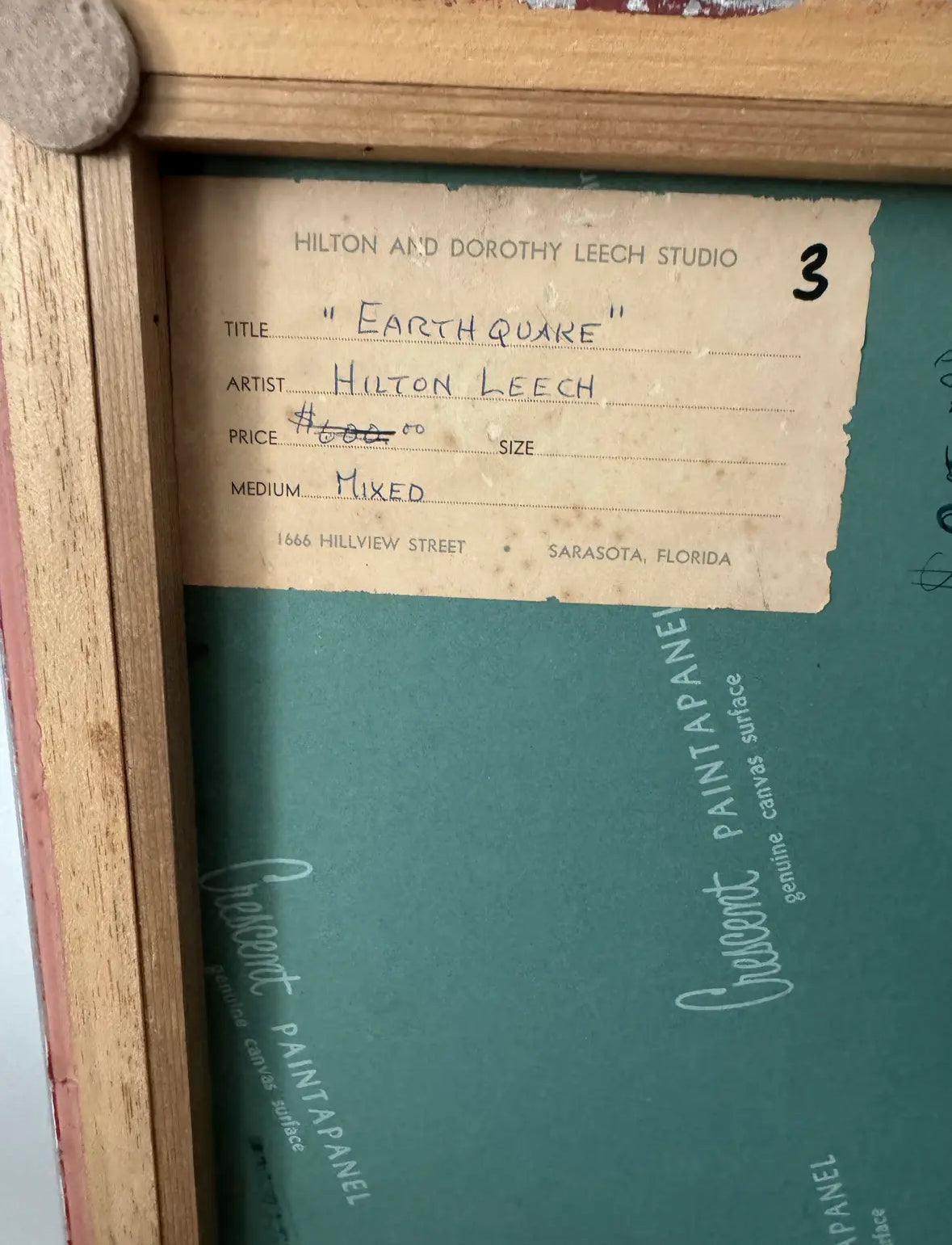 Very good vintage condition according to age and use. Some age toning to canvas visible, original silver-toned frame shows surface wear and paint loss (see photos), but remains stable and period-appropriate. Retains original gallery label from Hilton and Dorothy Leech Studio, Sarasota, Florida, with handwritten title and artist attribution.