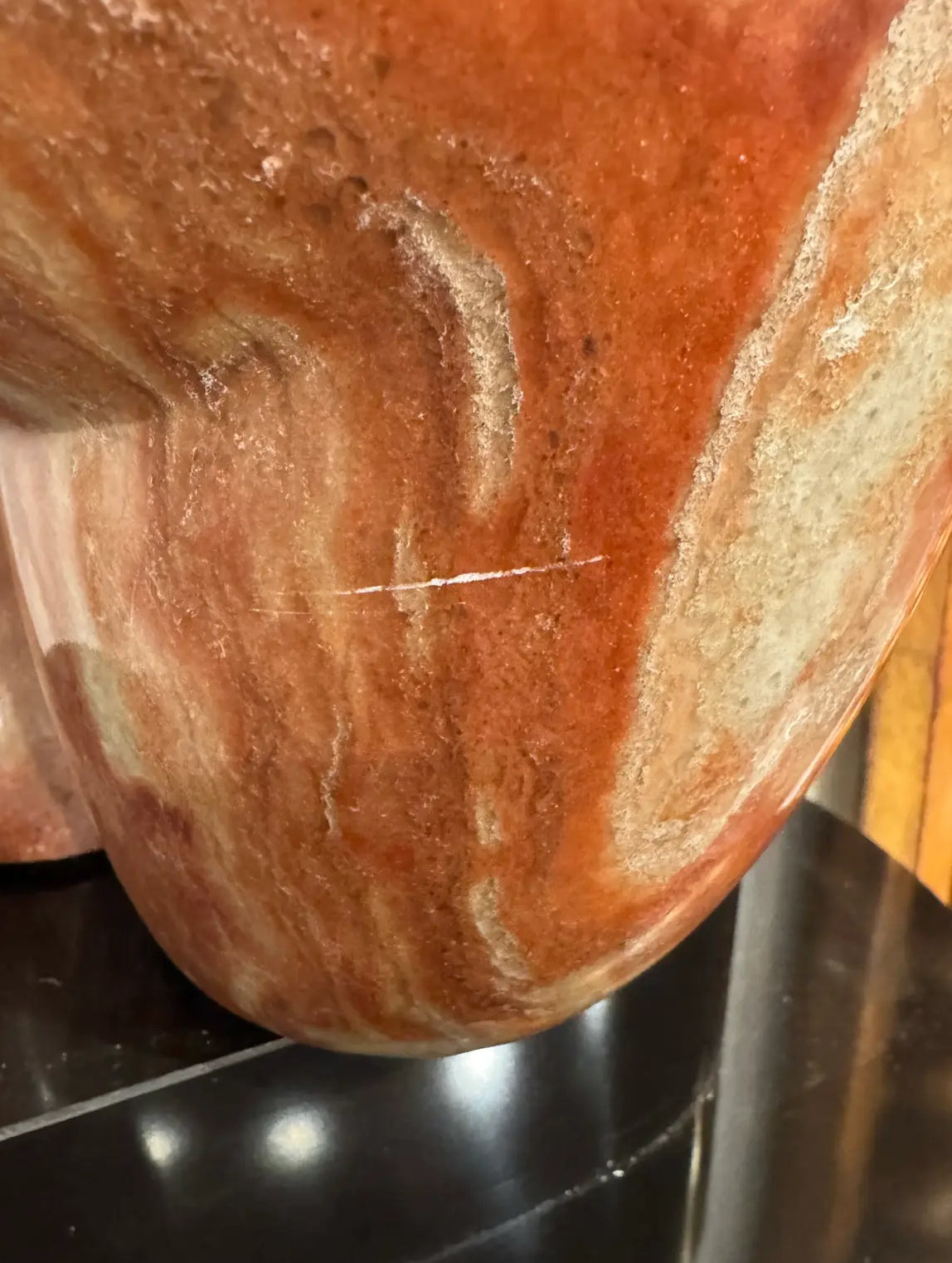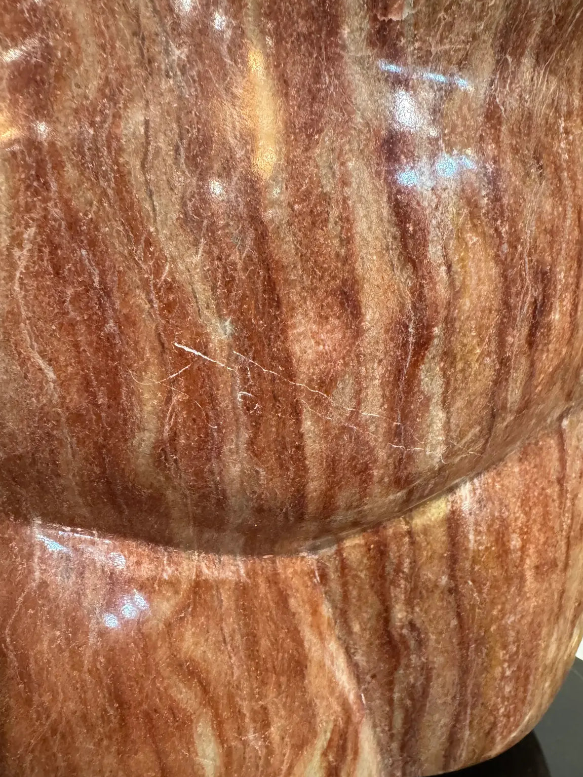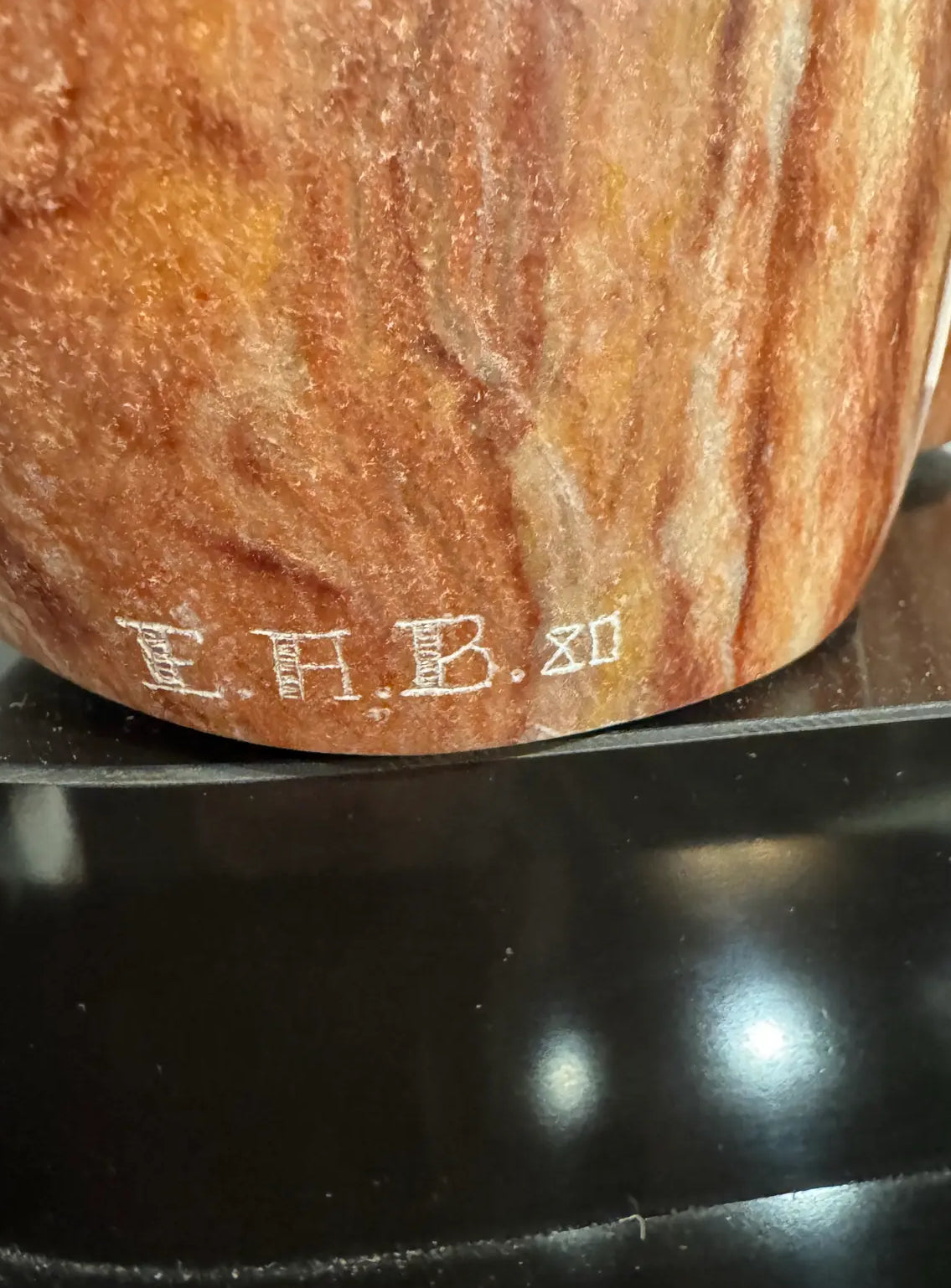 An exceptional Italian marble sculpture of a female torso, signed E.H.B. 80 on the base. Hand-carved from richly veined reddish-brown marble with natural striations of cream and green, this work masterfully balances classical sensuality with modern sculptural refinement. The smooth, voluptuous contours and highly polished surface emphasize the stone’s natural beauty and luminosity.
