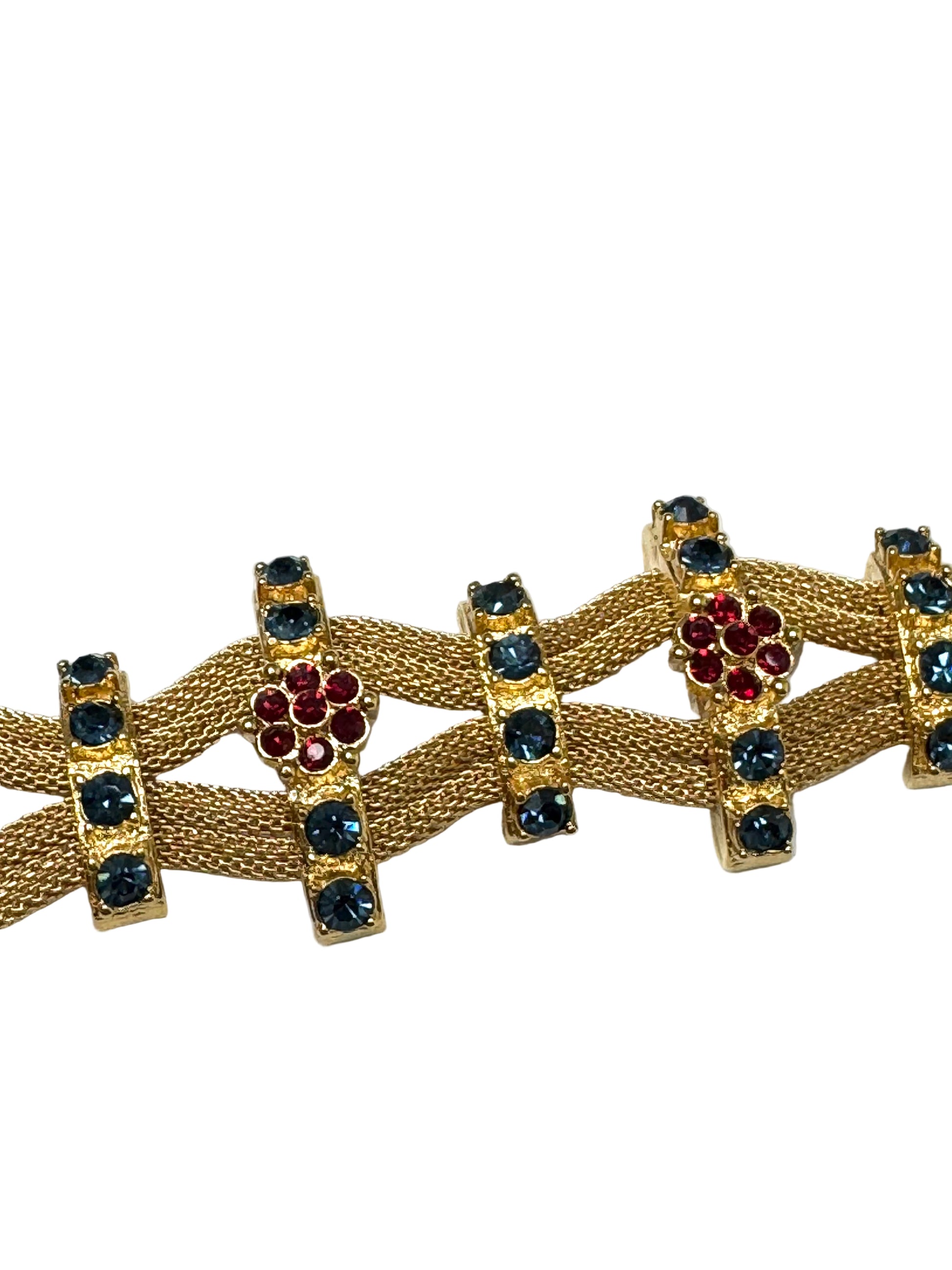 This vintage Joan Rivers signed bracelet showcases the designer’s signature flair for statement fashion jewelry. The piece features four bands of intricate woven chains, secured in a zig-zag pattern by gold-tone braces set with sparkling sapphire-blue glass stones. Every other brace is highlighted with a floral rosette of ruby-red crystals, adding a playful yet elegant contrast.