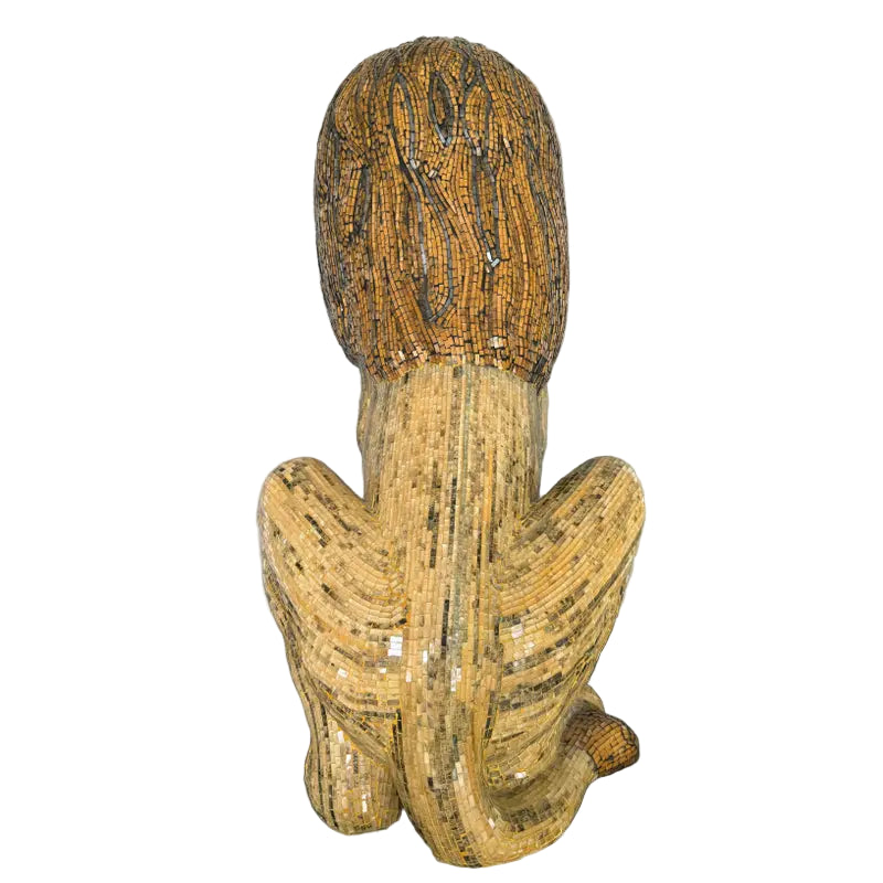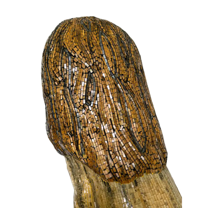 This extraordinary 30-inch lion statue is entirely handcrafted in shimmering mosaic glass, each tile meticulously placed to create a lifelike and regal depiction of the king of the jungle. Warm tones of amber, gold, and black glass capture the richness of the mane, while subtle highlights throughout the body lend dimension and movement.