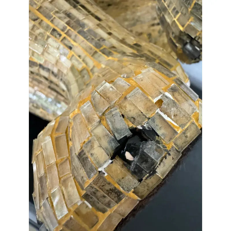 Overall, in great vintage condition considering age and fragility. Only a few small glass pieces are missing at the edge of a front paw, nearly unnoticeable unless viewed at eye level. The piece presents beautifully, with natural surface variations consistent with handcrafted mosaic work.