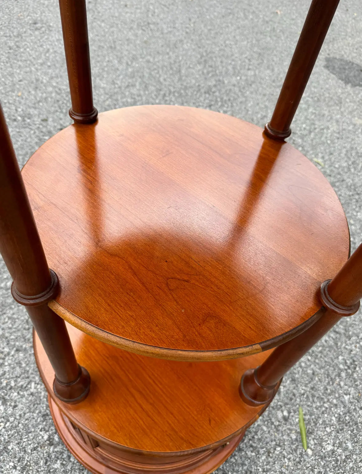 The true standout feature is its revolving base, allowing you to easily rotate the entire unit for convenient access to all sides. At the bottom, you'll find a convenient storage cabinet with a single door, ideal for stashing away items you'd prefer to keep out of sight. The rich wood tones and craftsmanship highlight its vintage charm, making it a standout piece in any room.