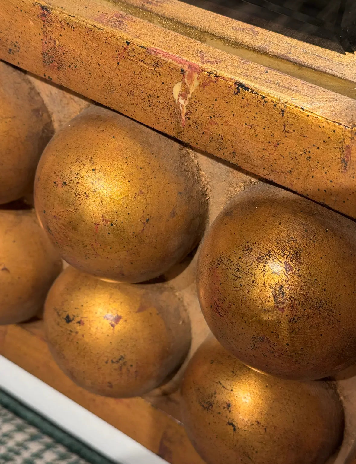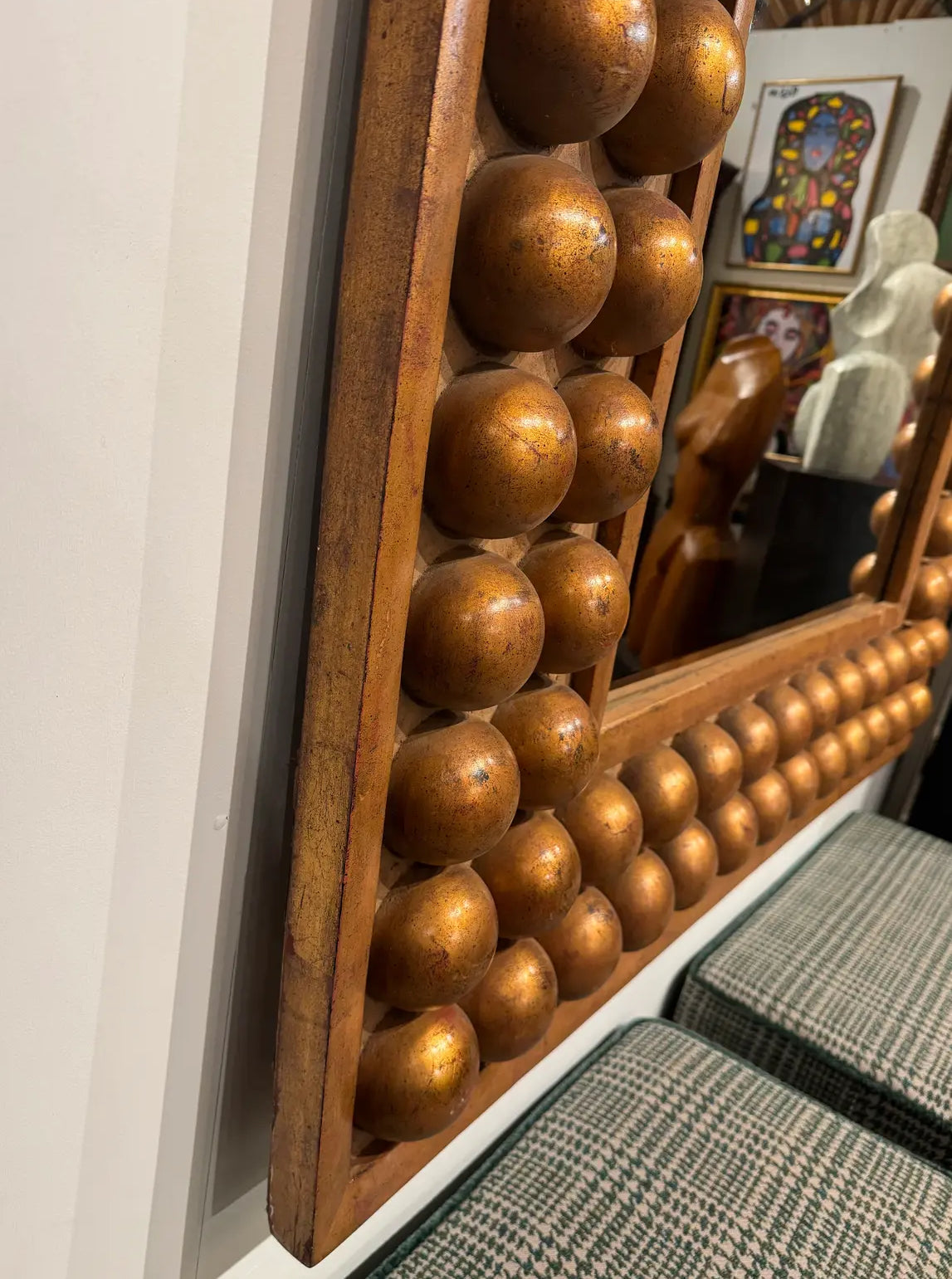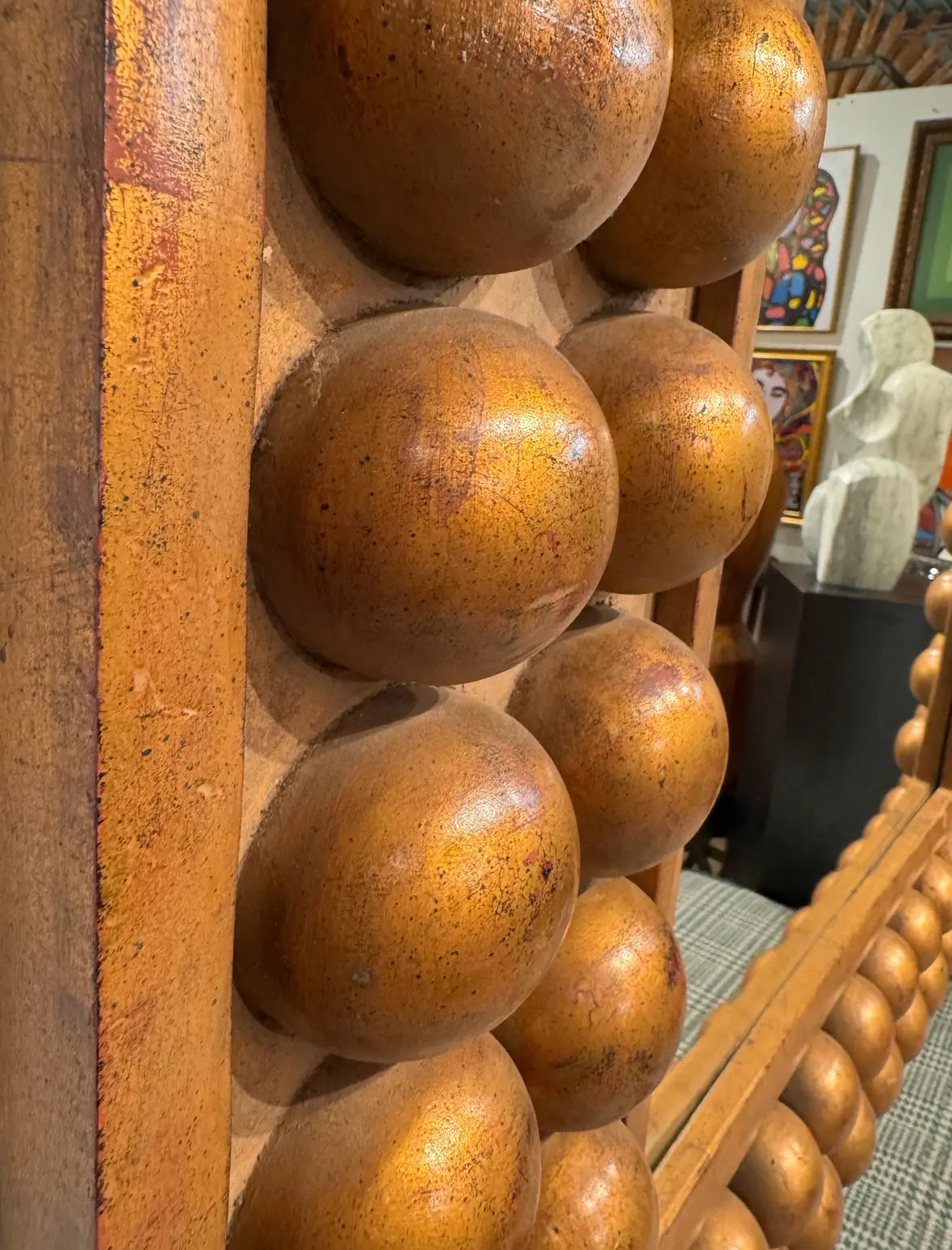A striking and sculptural mid-century Italian giltwood mirror featuring an oversized “bubble” frame design in warm antiqued gold. Each dome-shaped element is individually hand-finished, creating a rhythmic geometric pattern that catches the light beautifully. The frame’s dimensional texture and rich patina make it a true statement piece—bold, playful, and sophisticated.