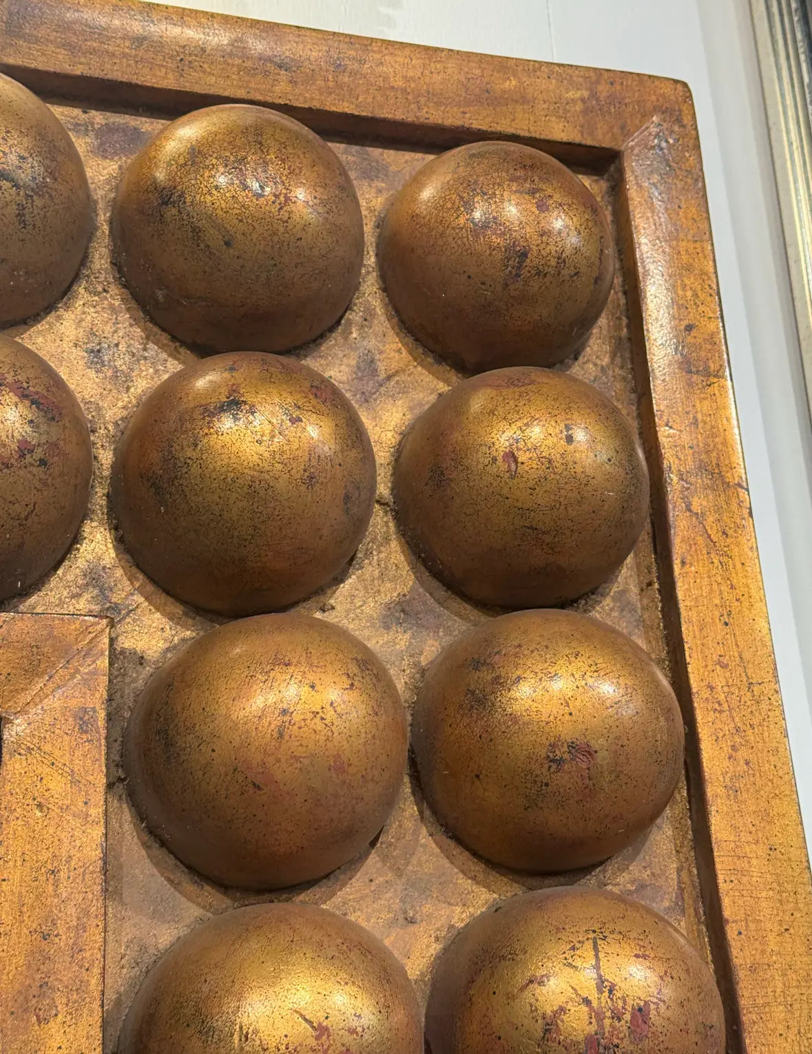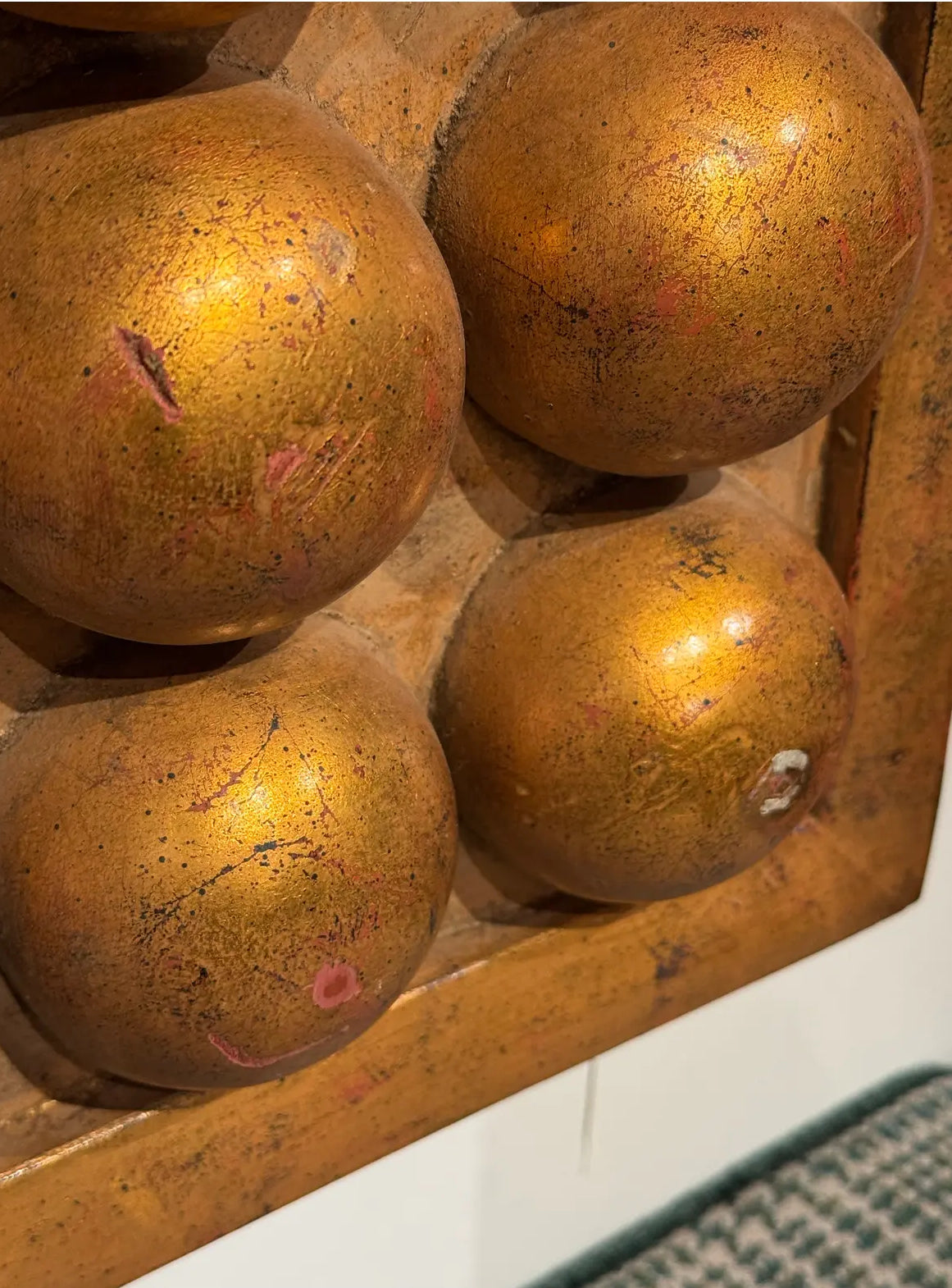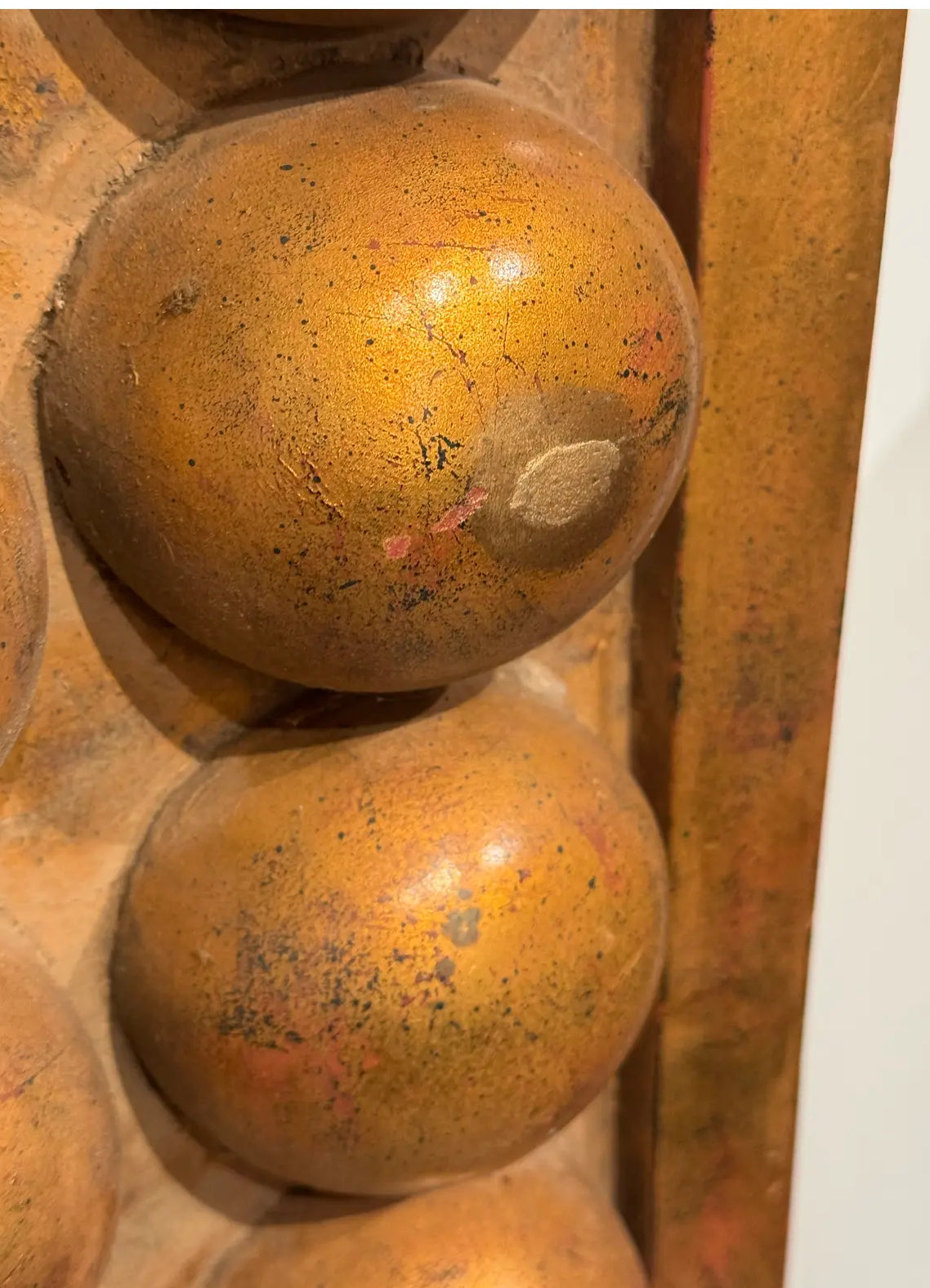 A striking and sculptural mid-century Italian giltwood mirror featuring an oversized “bubble” frame design in warm antiqued gold. Each dome-shaped element is individually hand-finished, creating a rhythmic geometric pattern that catches the light beautifully. The frame’s dimensional texture and rich patina make it a true statement piece—bold, playful, and sophisticated.