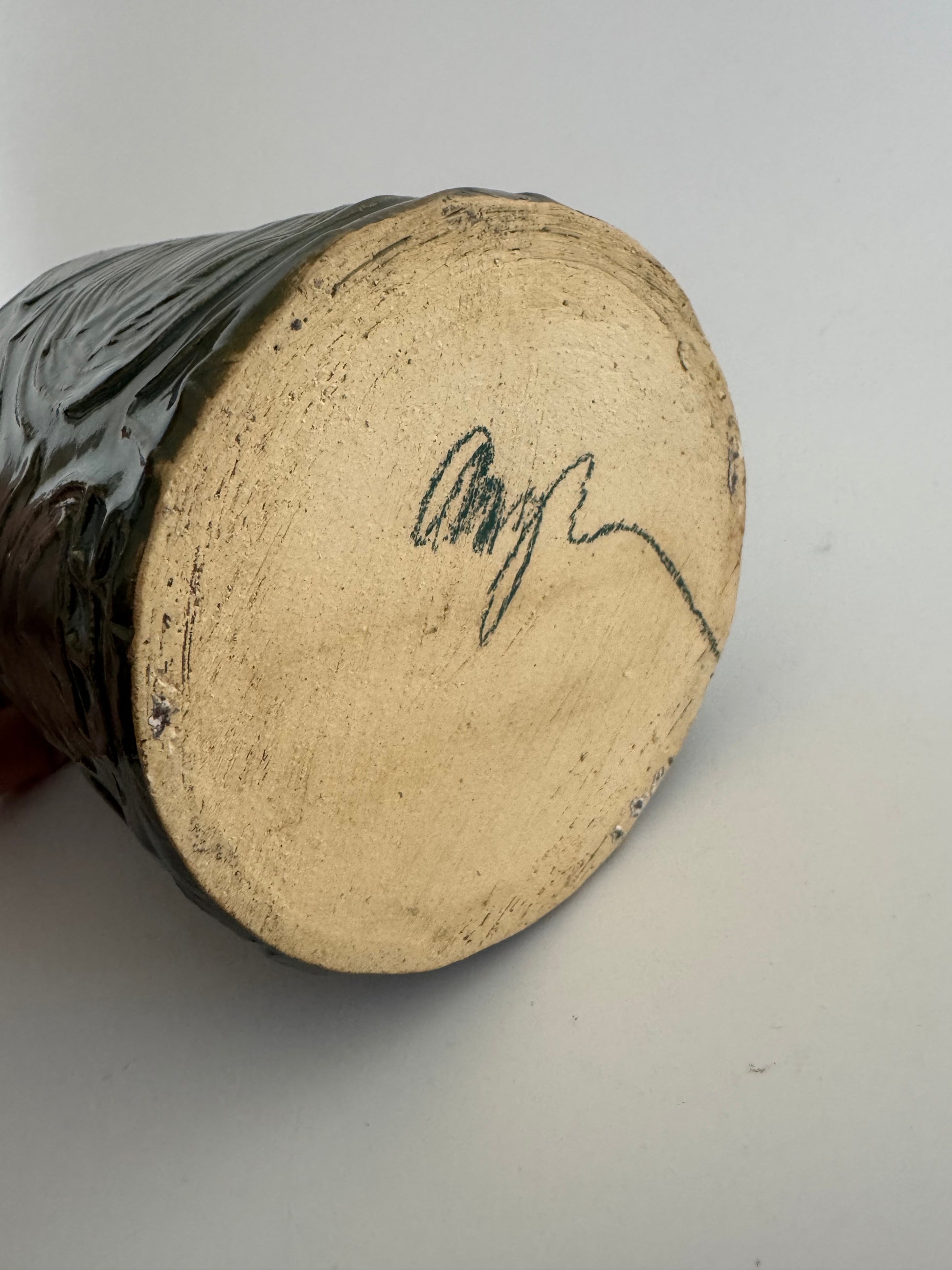 Signed Modernist Studio Pottery Vase with Geometric Relief and Teal Glaze