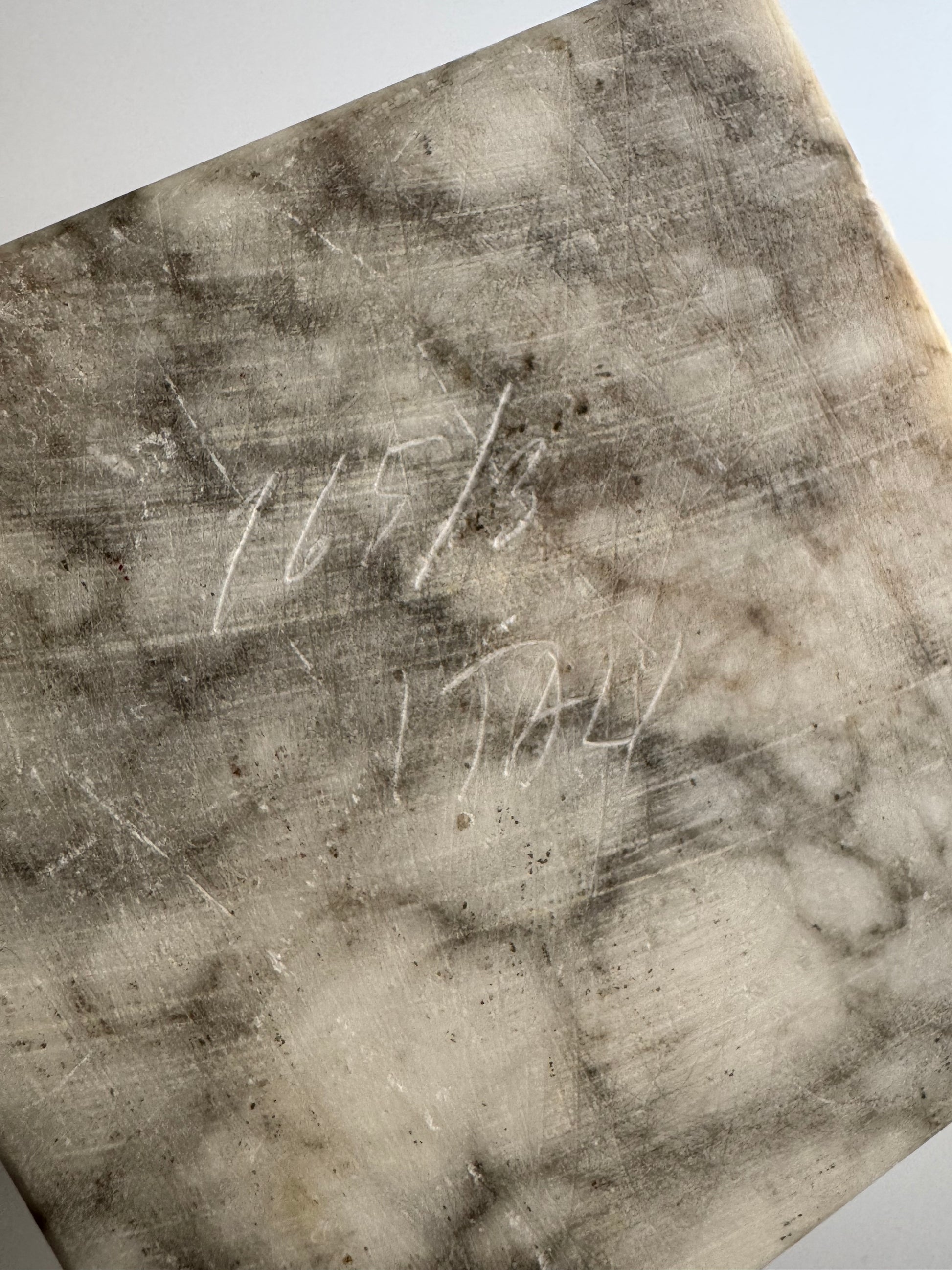 Good vintage condition according to age and use. One bookend shows a small chip to the marble base and light wear to the dog’s faces, as shown. Surface variations and natural inclusions in the alabaster are inherent to the material and add to their charm