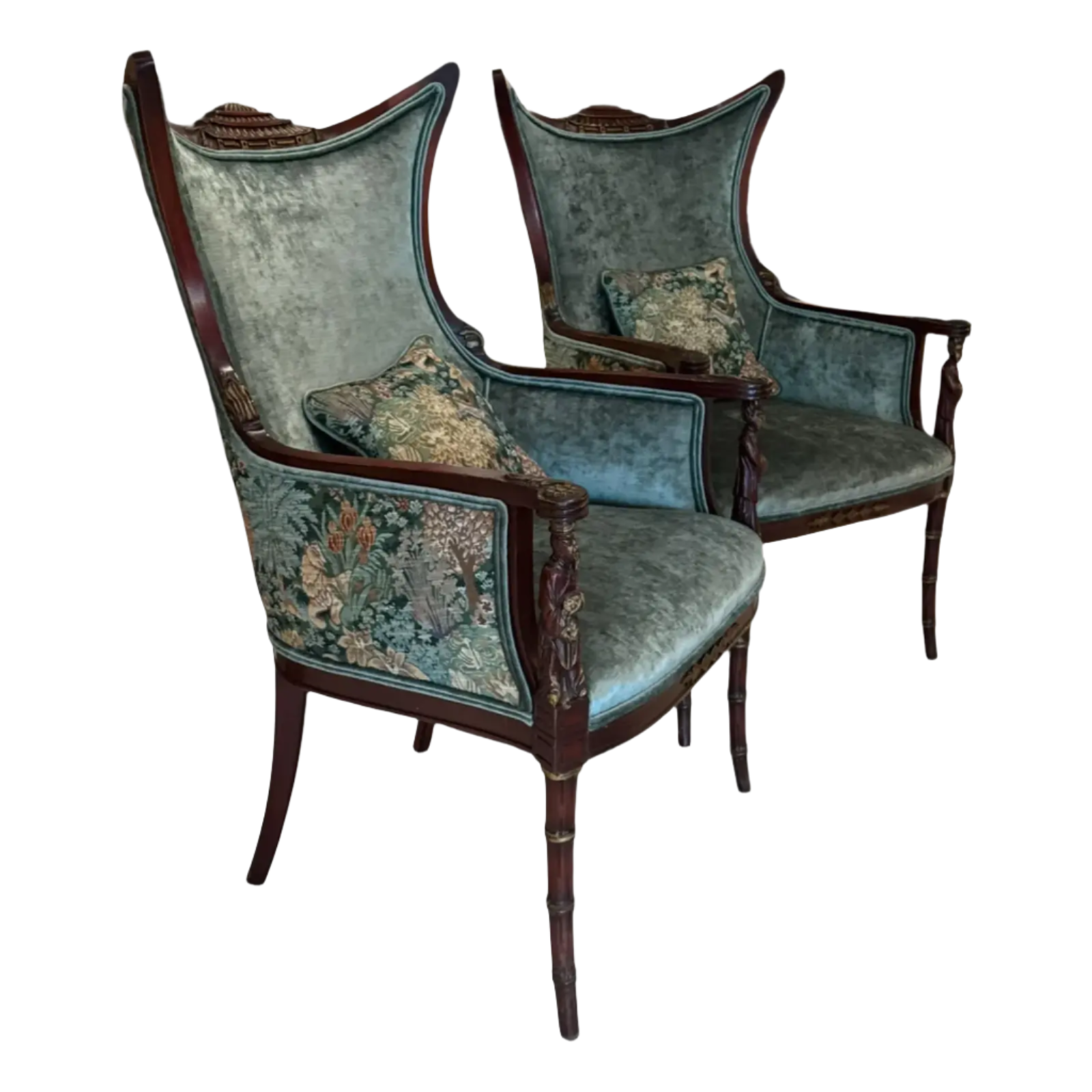 This exceptional pair of vintage high back wing chairs effortlessly blends regal form with fresh, luxurious materials. Featuring tall, dramatically flared backs and beautifully carved wooden frames, these chairs offer the perfect mix of classic elegance and modern comfort.