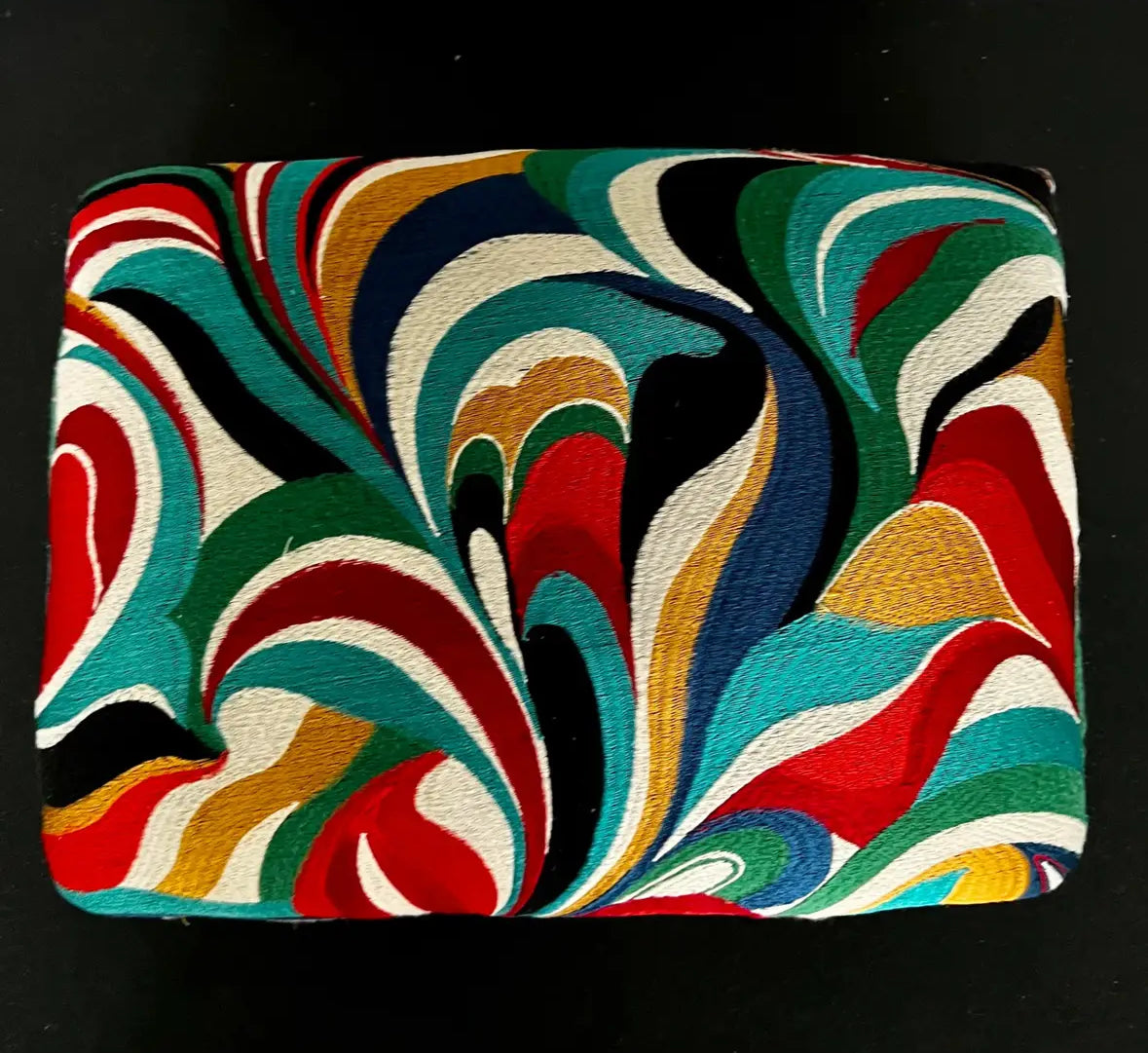Refinished Mid-Century Modern Footstool With Abstract Multicolor Embroidered Fabric
