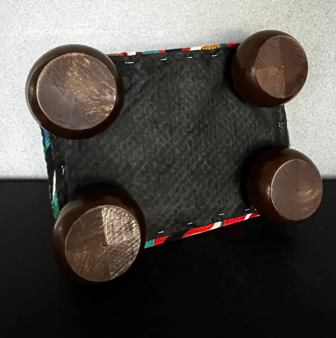 Stunning small Mid-Century Modern footstool that has been fully refinished including new foam and padding, this vibrant multicolor abstract embroidered fabric is the pop of color needed in any room