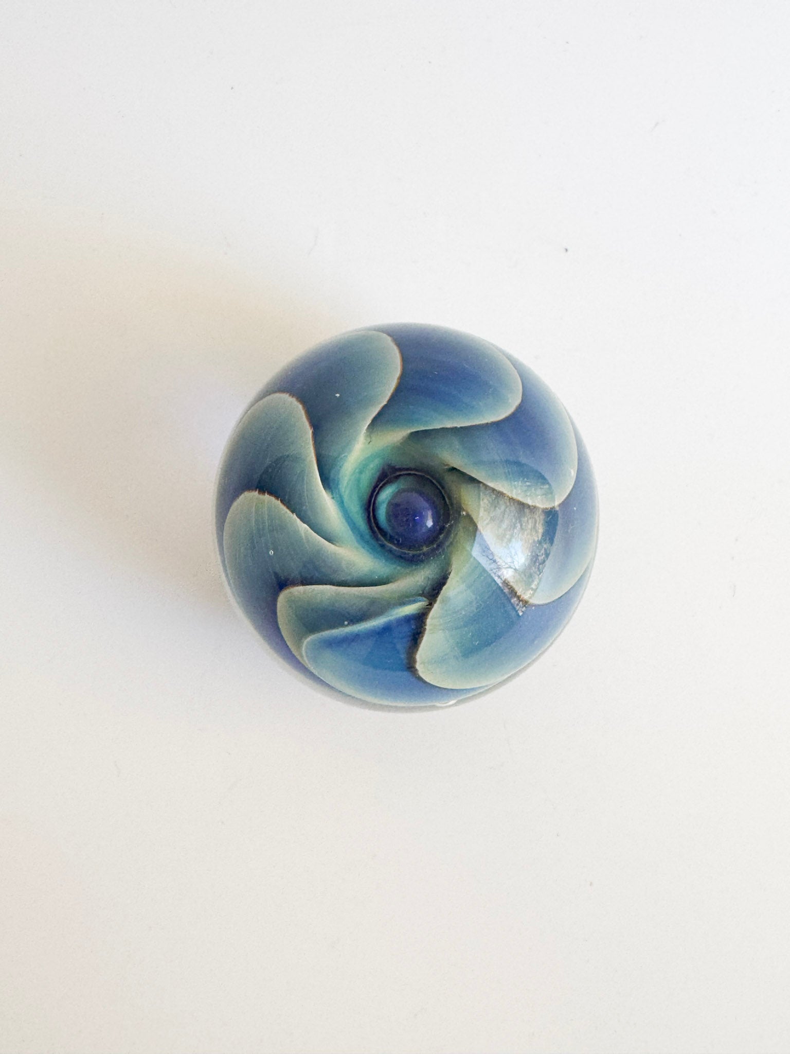 Signed 1986 Studio Art Glass Paperweight – Blue & Aqua Swirl Flower Form