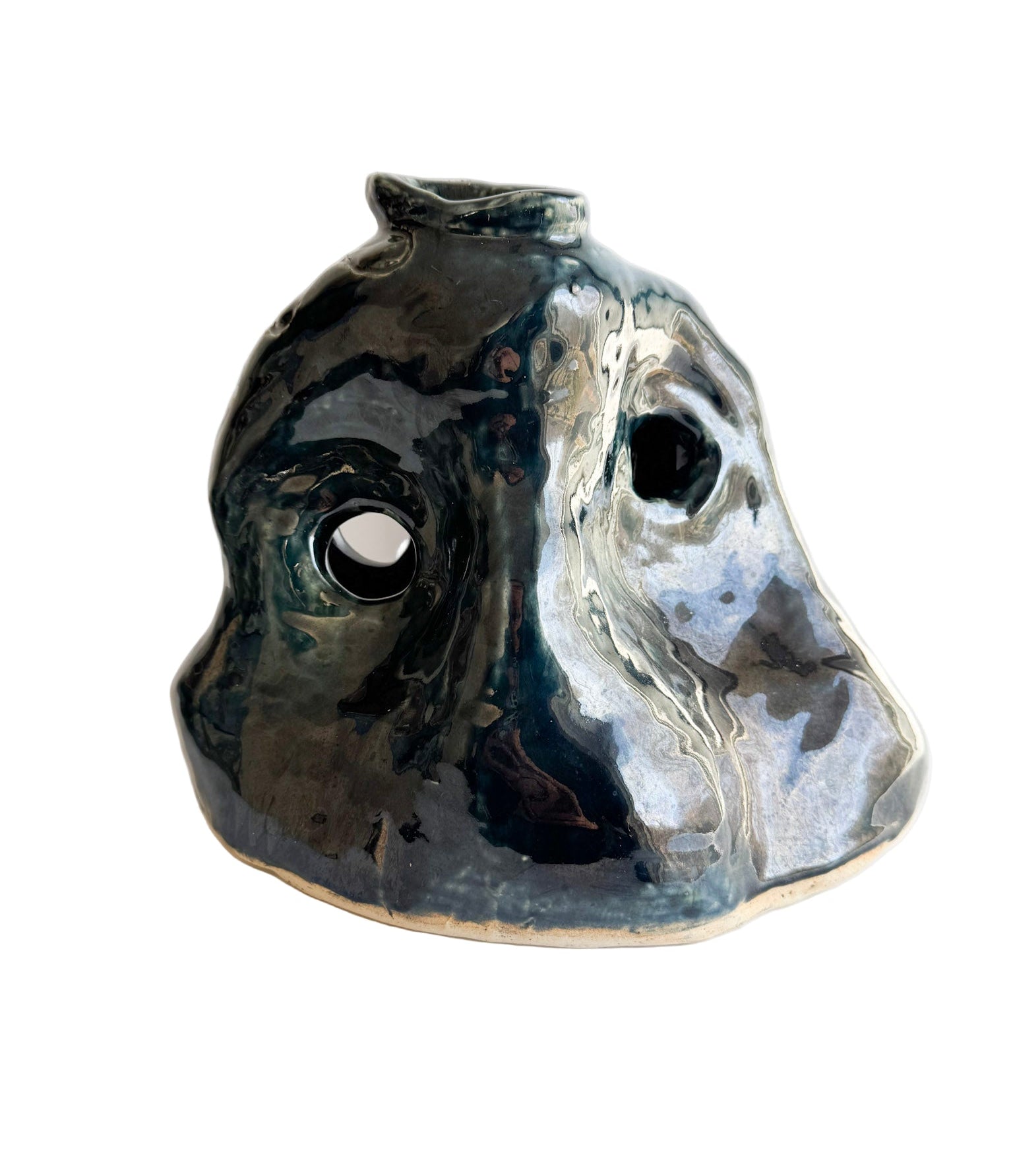 A striking hand-built ceramic art vessel signed ISA, featuring a deeply expressive, organic form with sculptural contours and an almost creature-like presence. Its abstract, asymmetrical silhouette and glossy, layered glaze in moody charcoal, deep green, and hints of blue give the piece a mesmerizing depth and movement.