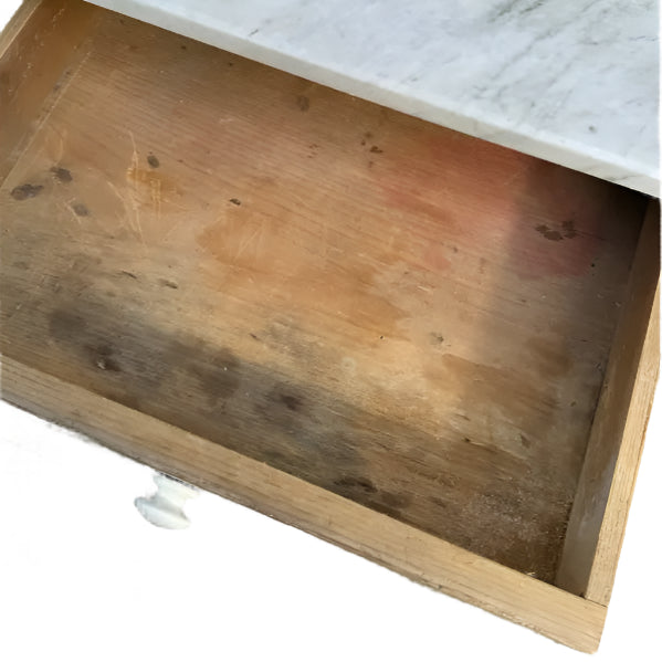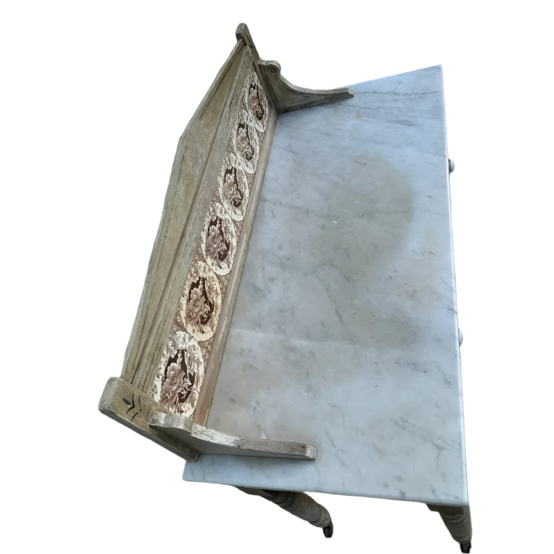 This antique washstand is a rare find for lovers of vintage character and rustic charm. Crafted from fruitwood, it features a stunning Carrara marble top and a decorative tile backsplash, showcasing a lovely hand-painted design. The piece boasts two spacious drawers, ideal for storage, and intricate painted details that add to its historic appeal. The original aged paint and natural patina give this piece a timeless feel, perfect for any vintage or farmhouse-inspired space.