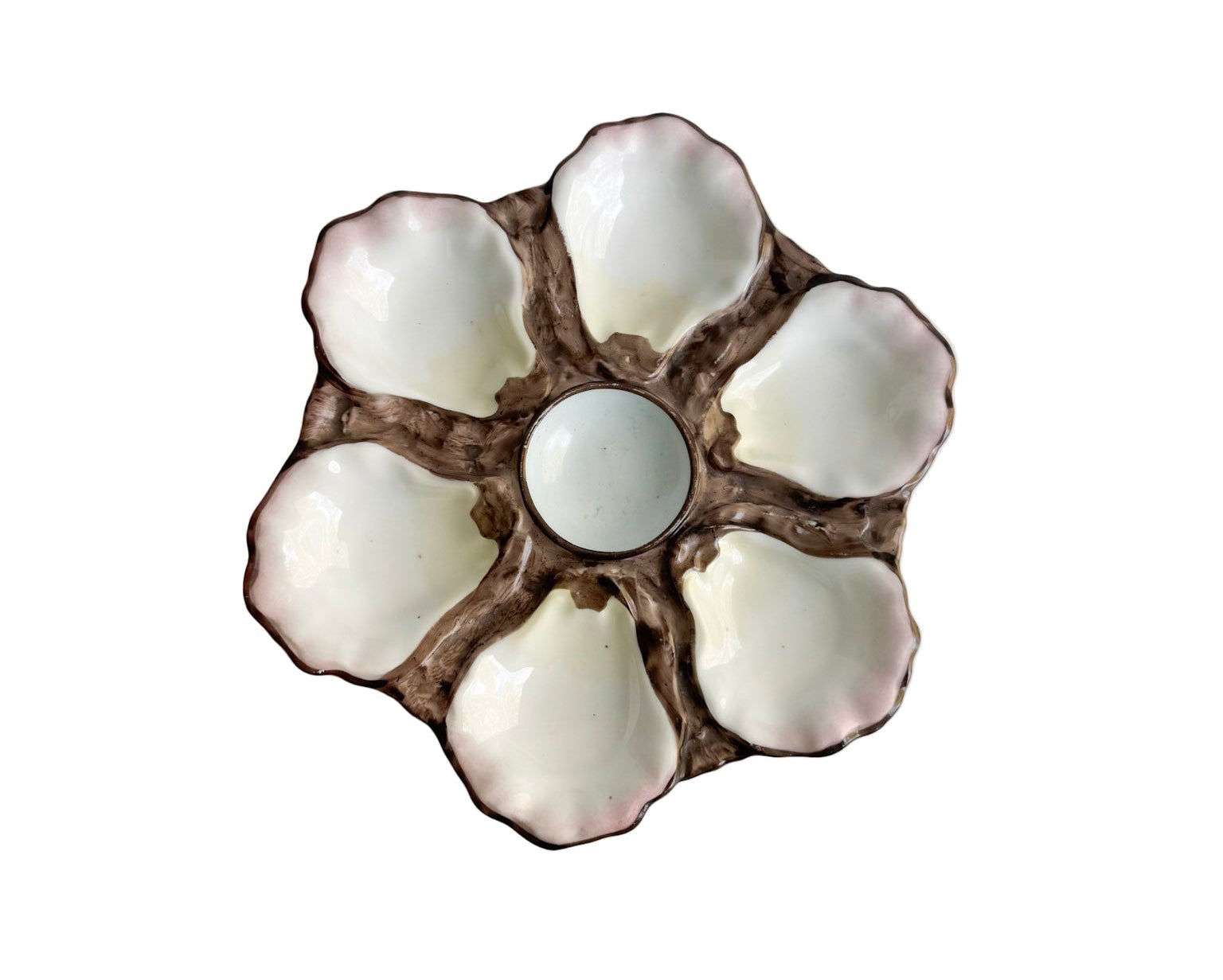 A lovely vintage ceramic oyster plate in the classic French Majolica style, featuring six shell-form wells surrounding a center sauce bowl. The piece is beautifully glazed in soft cream tones with subtle blush pink edges and rich brown branch-like detailing, evoking the organic texture of oyster shells.
