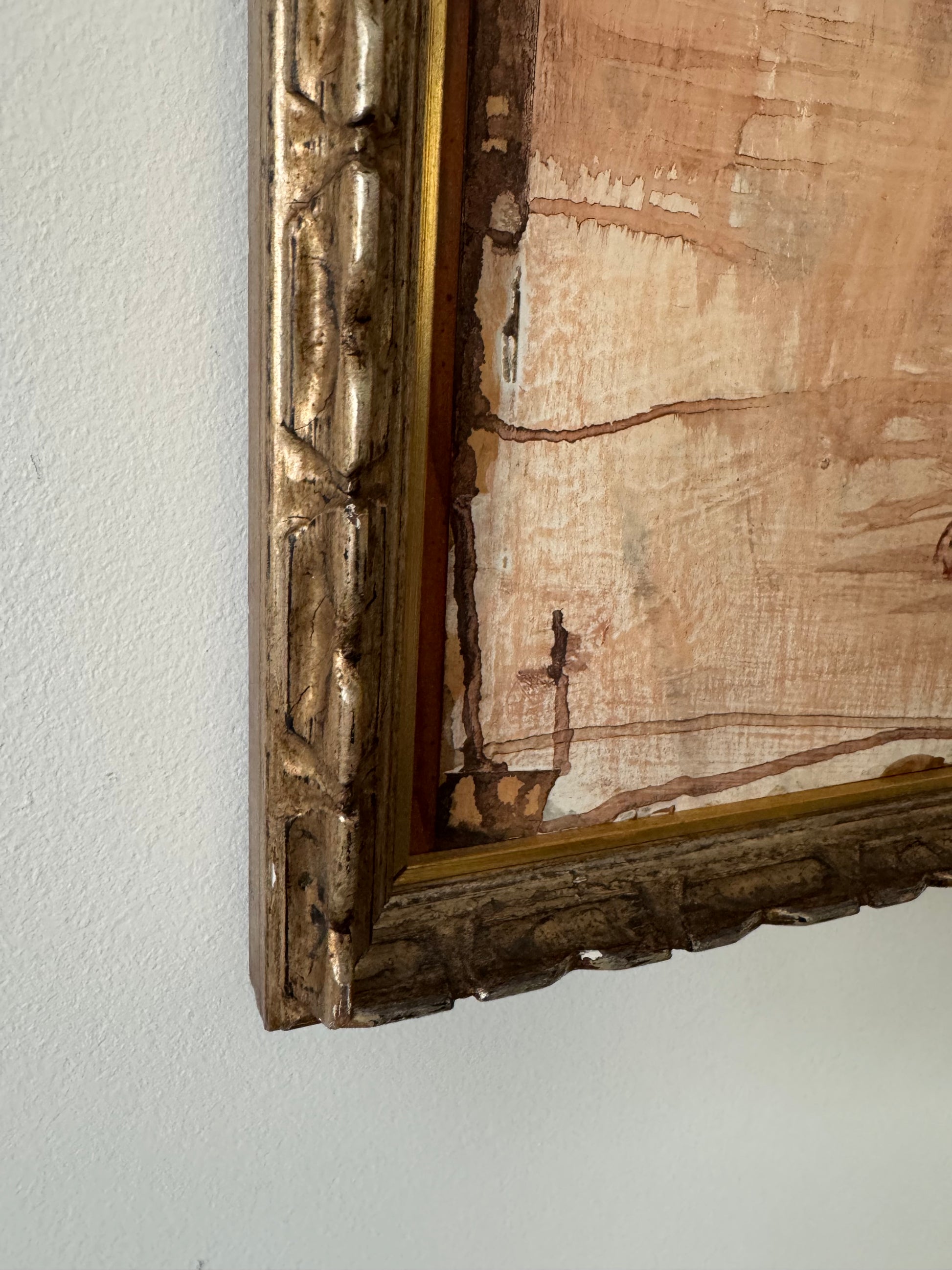 A striking original 1965 mixed media painting signed Bastille, capturing the quiet introspection of a seated figure rendered in warm sienna and oxblood tones. The expressive, fluid lines and softly abstracted form reflect a modernist sensibility reminiscent of mid-century European expressionism. Textural layers and the visible brushwork create a raw, emotional quality that draws the viewer in.