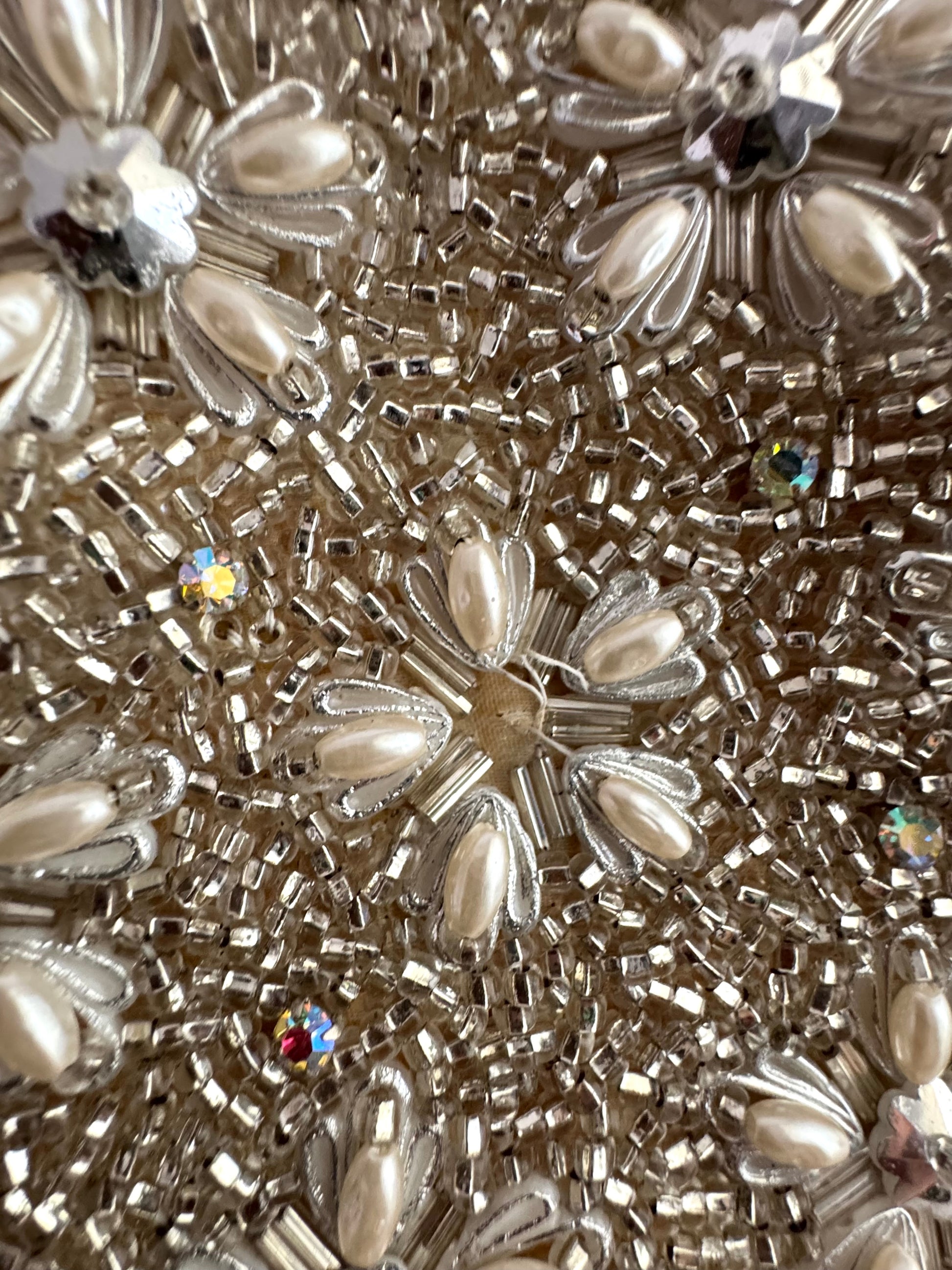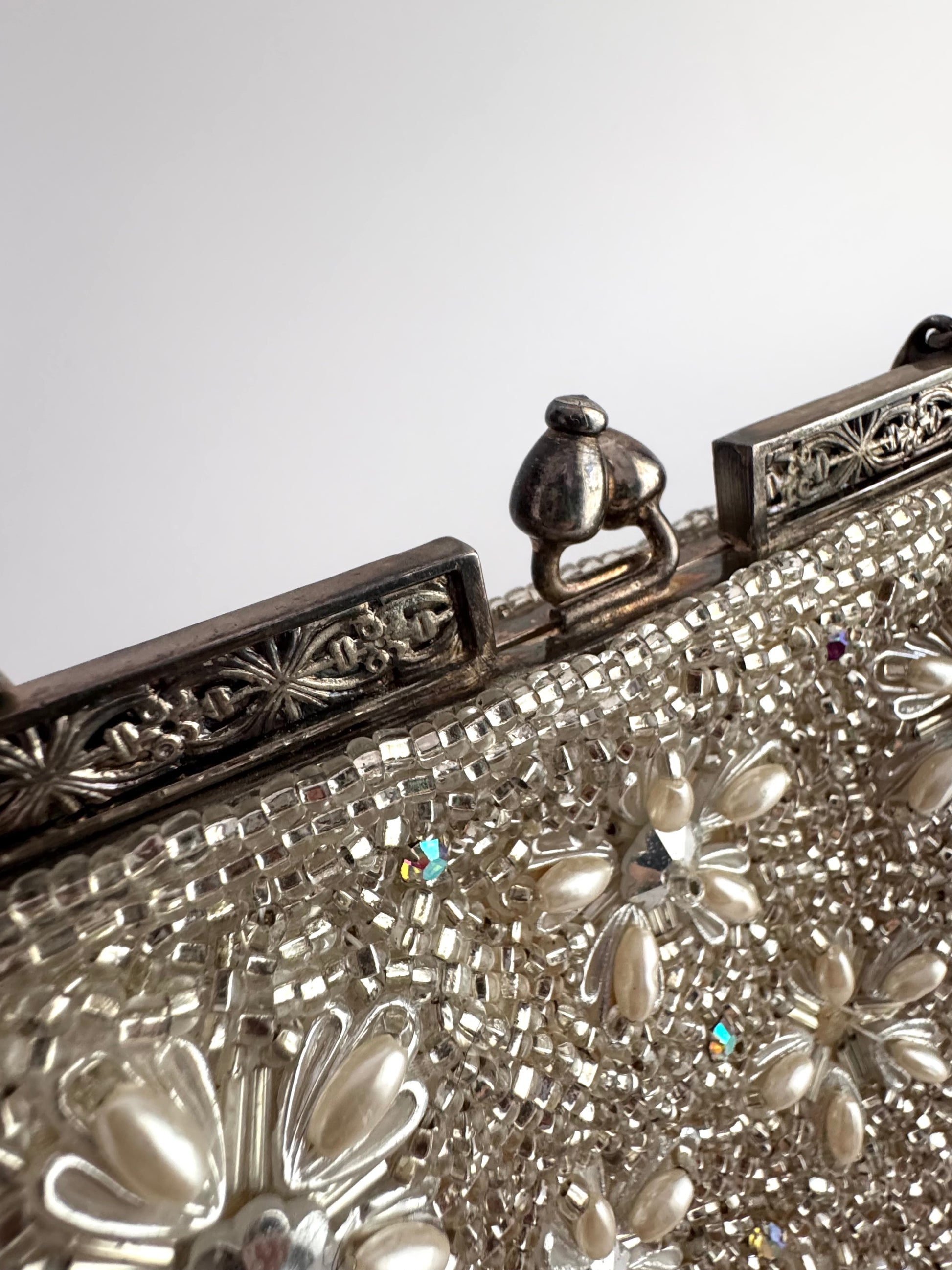 This exquisite vintage evening bag is fully hand-beaded with luminous seed beads, faux pearls, and sparkling crystals, forming an elegant floral motif. The silver-tone metal frame features intricate repoussé detailing and a kiss-lock clasp, paired with a delicate snake chain handle. Inside, the bag is lined in ivory satin with a small side pocket, maintaining its timeless sophistication.