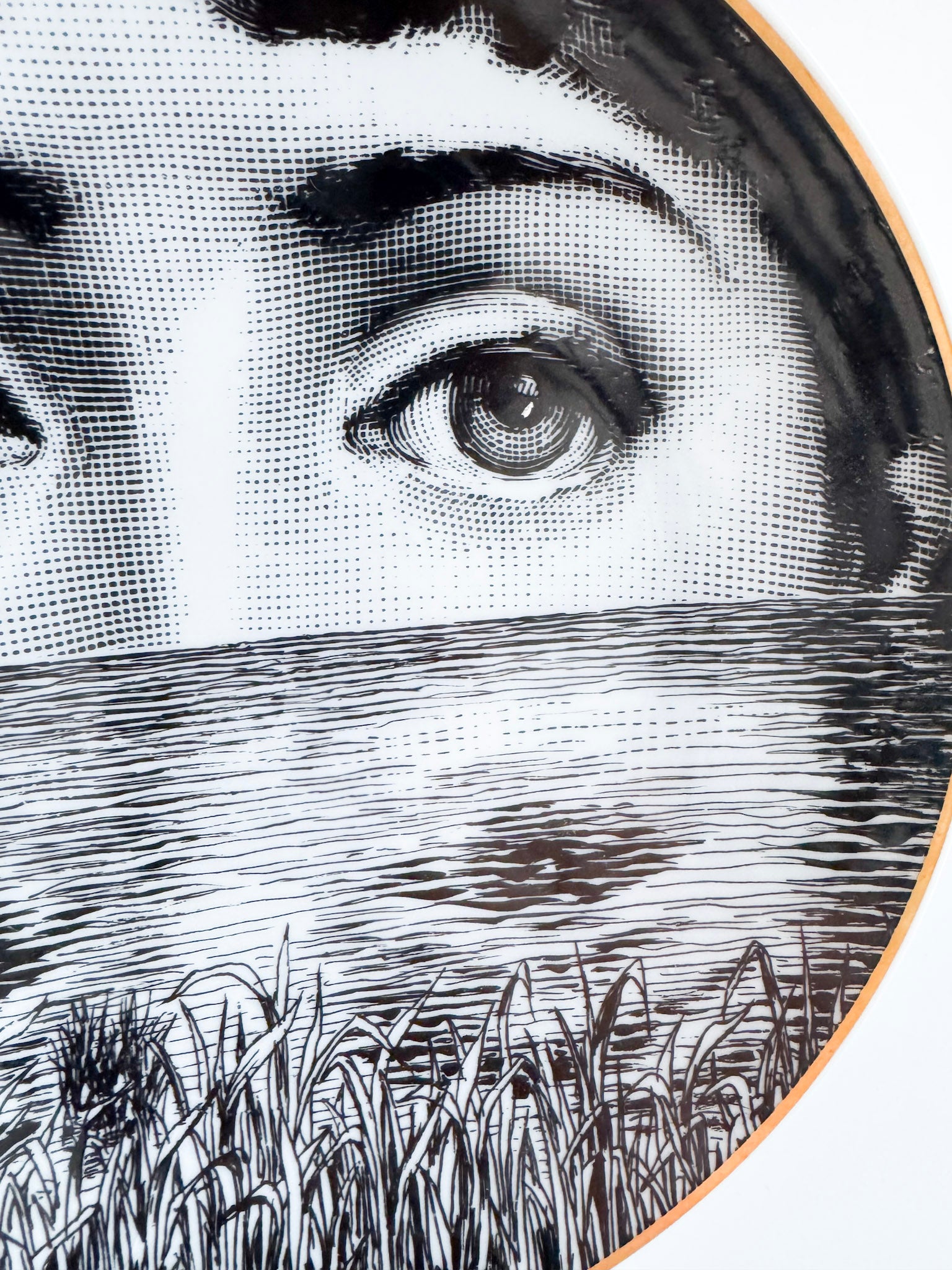 This striking black-and-white composition shows a surreal female gaze emerging above water and reeds, one of Fornasetti’s most poetic and collectible visual themes.