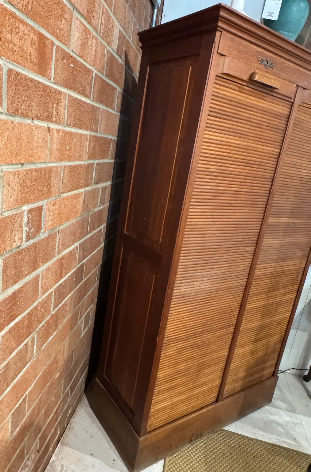 Vintage Oak Tambour Door Filing Cabinet With Sliding Trays & Original Keys