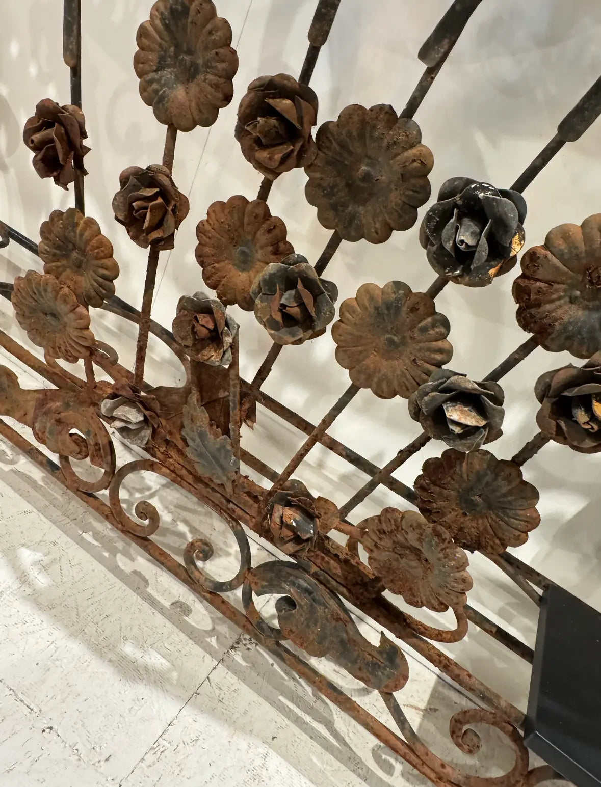 A striking vintage wrought iron console table in the French style, featuring elegant scrollwork, acanthus leaf motifs, and hand-forged floral details. The base displays rich patina and natural oxidation from age, creating a beautifully timeworn character. The cream-toned marble top is a later addition, complementing the sculptural ironwork with a soft, refined contrast.
